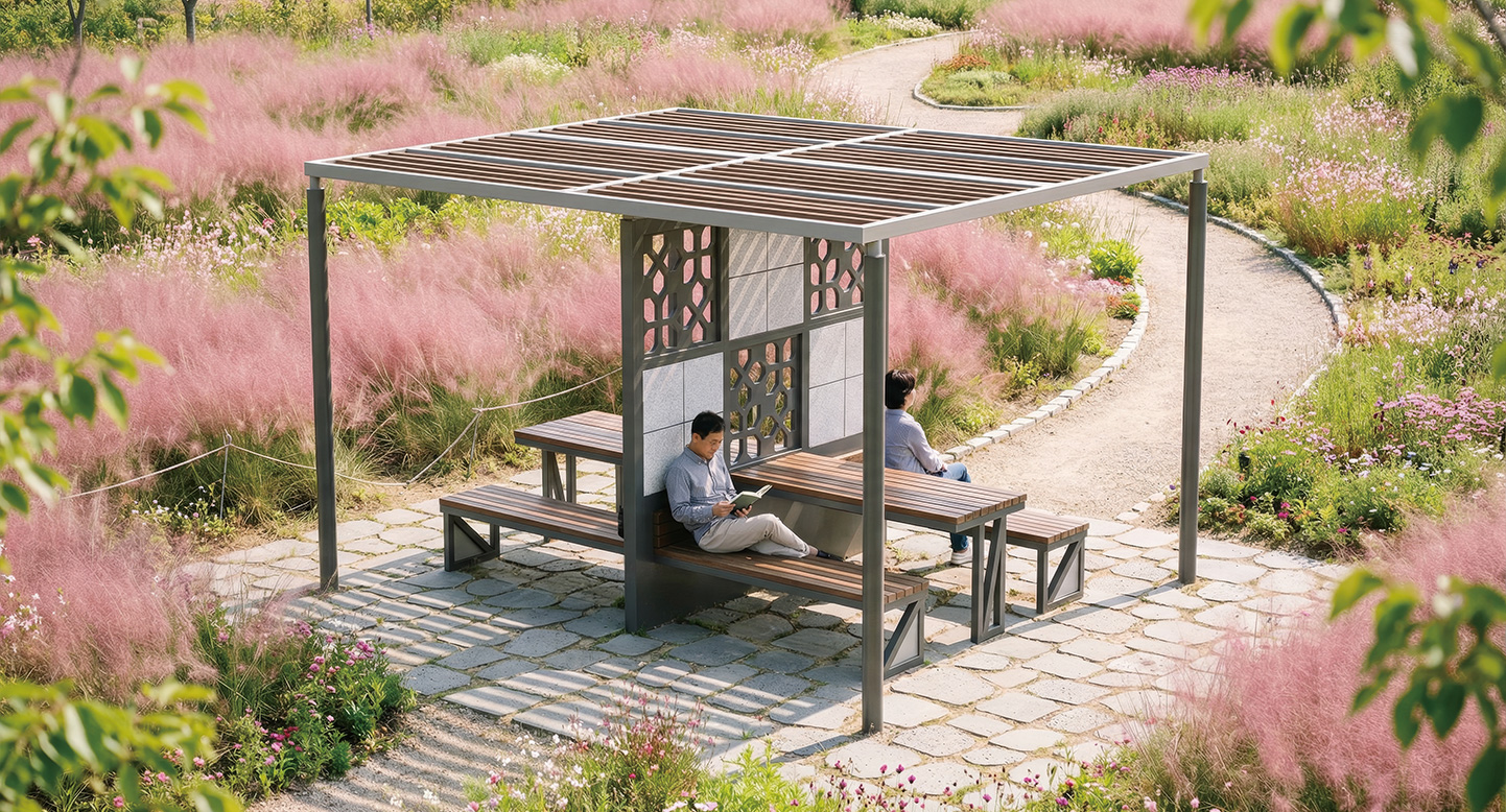 리프월 쉘터 플러스 1(LEAF WALL SHELTER PLUS 1)|DAUM-P-176B 제품목록으로 바로가기 자료 및 바로가기 나라장터 바로연결 도면 다운로드 시공사진 보러가기 기타 정사각 대리석 패턴과 나뭇잎 타공 가벽이 중심을 이루는 사각 소형 복합형으로, 시선과 동선을 자연스럽게 분리해 소규모 휴식과 대화를 안정적으로 수용하는 모던 쉘터입니다. 제품명 리프월 쉘터 플러스 1(LEAF WALL SHELTER PLUS 1)|DAUM-P-176B 물품식별번호 24150303 규격 3,627 X 3,627 X 2,425(H) 재질 stl, galvanized, hard wood, birch plywood, hpl, PC 리프월 쉘터 플러스 1(LEAF WALL SHELTER PLUS 1)|DAUM-P-176B 물품식별번호 24150303 규격 3,627 X 3,627 X 2,425(H) 재질 stl, galvanized, hard wood, birch plywood, hpl, PC 기타 정사각 대리석 패턴과 나뭇잎 타공 가벽이 중심을 이루는 사각 소형 복합형으로, 시선과 동선을 자연스럽게 분리해 소규모 휴식과 대화를 안정적으로 수용하는 모던 쉘터입니다. 자료 및 바로가기 나라장터 바로연결 도면 다운로드 시공사진 보러가기