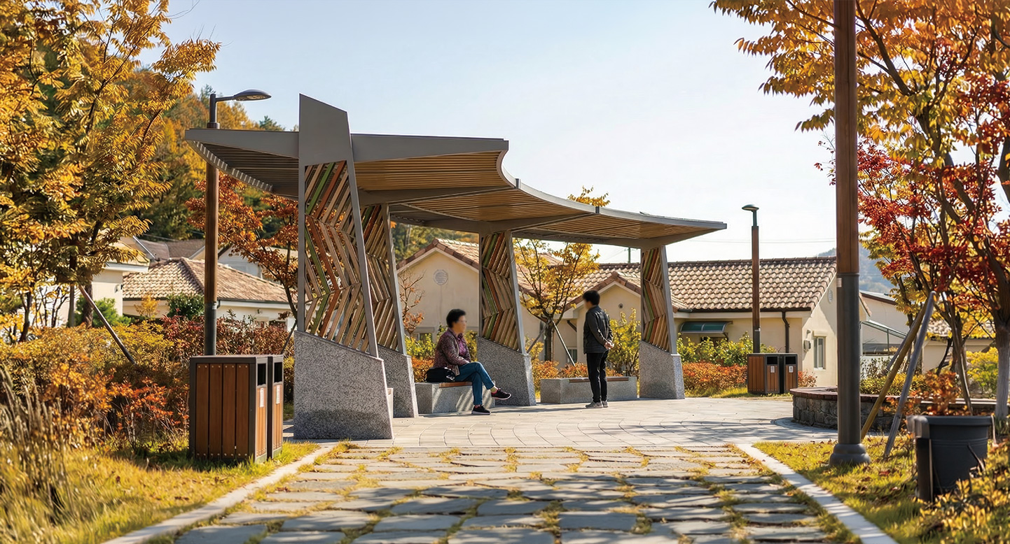 지오 커브 와이드 라인(GEO CURVE WIDE LINE)|DAUM-P-426A-3 제품목록으로 바로가기 자료 및 바로가기 나라장터 바로연결 도면 다운로드 시공사진 보러가기 기타 넓게 펼쳐진 곡선 지붕 아래 기하학적 패턴 기둥이 든든하게 받쳐줍니다. 구조적인 안정감과 유려한 미학을 동시에 갖춘 모델입니다. 제품명 지오 커브 와이드 라인(GEO CURVE WIDE LINE)|DAUM-P-426A-3 물품식별번호 25029131 규격 10,025 X 3,761 X 2,900(H) 재질 stl, hard wood, polycarbonate, 화강석 지오 커브 와이드 라인(GEO CURVE WIDE LINE)|DAUM-P-426A-3 물품식별번호 25029131 규격 10,025 X 3,761 X 2,900(H) 재질 stl, hard wood, polycarbonate, 화강석 기타 넓게 펼쳐진 곡선 지붕 아래 기하학적 패턴 기둥이 든든하게 받쳐줍니다. 구조적인 안정감과 유려한 미학을 동시에 갖춘 모델입니다. 자료 및 바로가기 나라장터 바로연결 도면 다운로드 시공사진 보러가기
