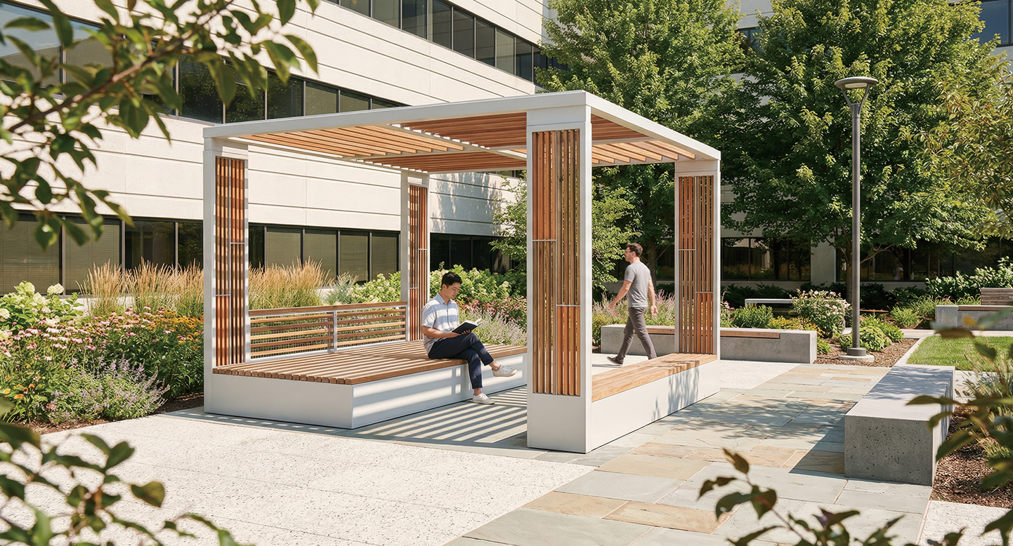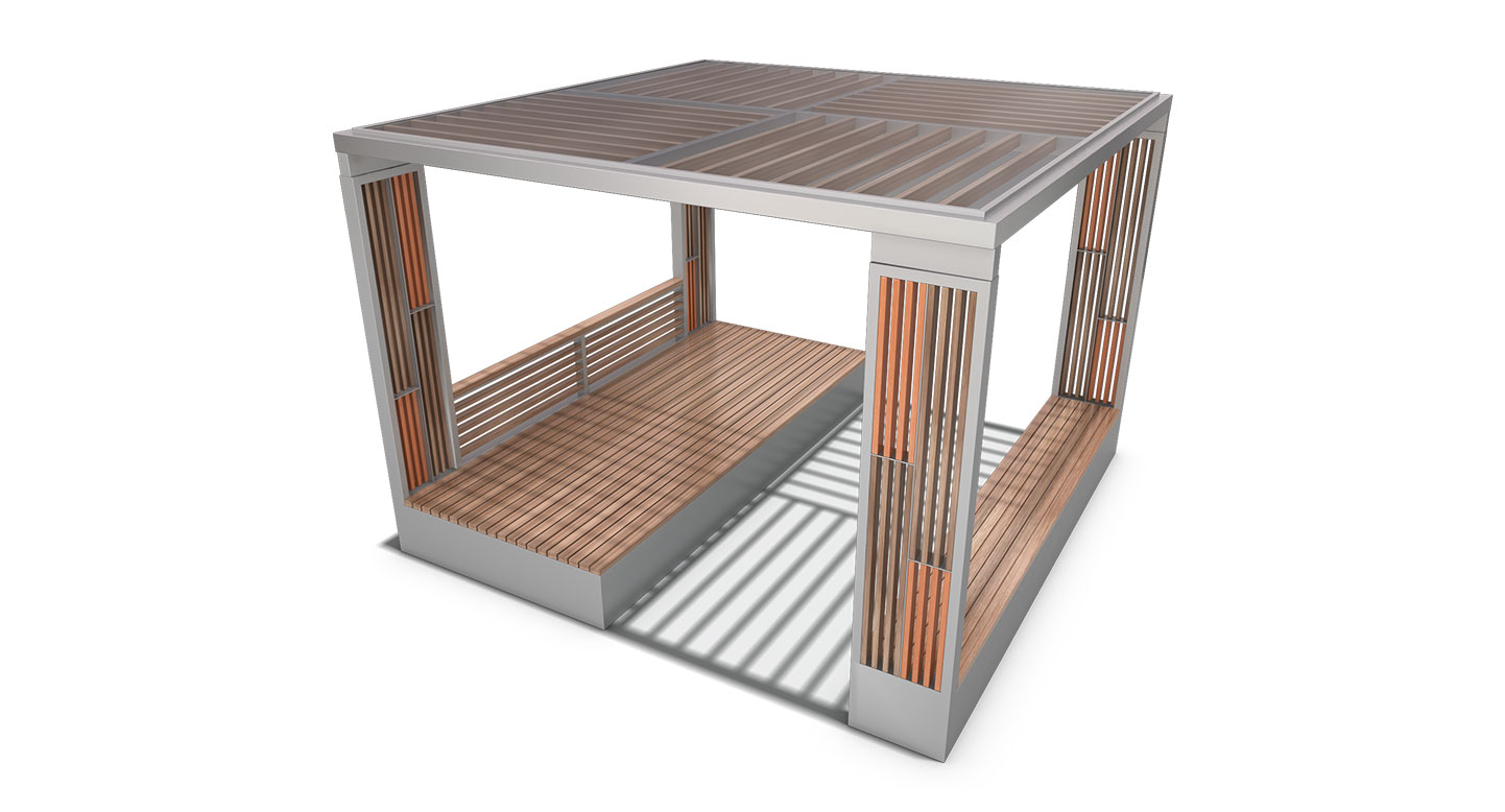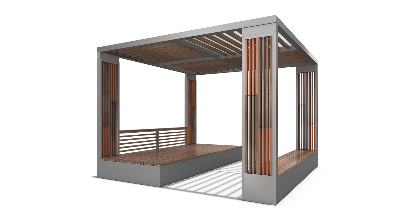 프레임라운지 플러스(FRAMELOUNGE PLUS)|DAUM-P-174B 제품목록으로 바로가기 자료 및 바로가기 나라장터 바로연결 도면 다운로드 시공사진 보러가기 기타 정사각 프레임 구조와 우드 라인 패턴이 결합된 사각 소형 복합형으로, 지붕·벽·벤치가 하나의 구조로 연결되어 안정적인 휴식과 자연스러운 체류를 동시에 제공하는 모던 쉘터 공간입니다. 제품명 프레임라운지 플러스(FRAMELOUNGE PLUS)|DAUM-P-174B 물품식별번호 24147628 규격 3,600×3,600×2,600(H) 재질 stl, hard wood, galvanized, polycarbonate 프레임라운지 플러스(FRAMELOUNGE PLUS)|DAUM-P-174B 물품식별번호 24147628 규격 3,600×3,600×2,600(H) 재질 stl, hard wood, galvanized, polycarbonate 기타 정사각 프레임 구조와 우드 라인 패턴이 결합된 사각 소형 복합형으로, 지붕·벽·벤치가 하나의 구조로 연결되어 안정적인 휴식과 자연스러운 체류를 동시에 제공하는 모던 쉘터 공간입니다. 자료 및 바로가기 나라장터 바로연결 도면 다운로드 시공사진 보러가기