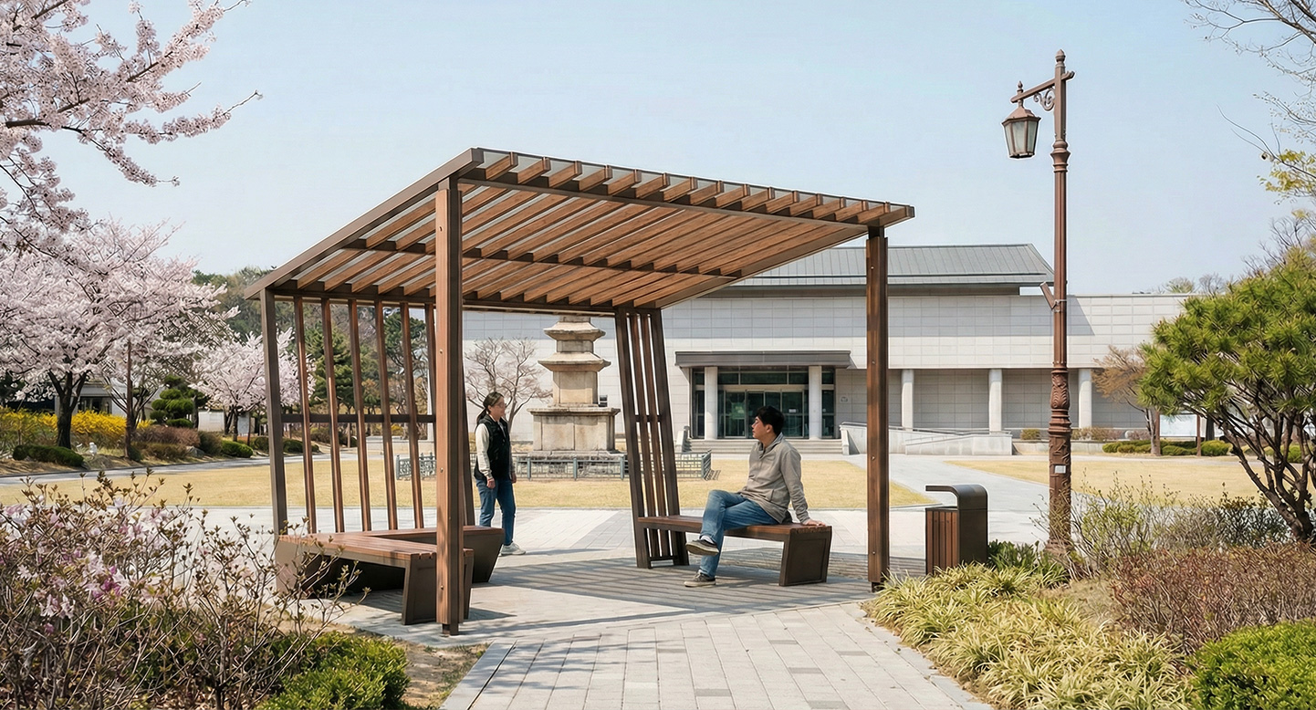 슬로프 루버 플러스 (SLOPE LOUVER PLUS)|DAUMP-179E 제품목록으로 바로가기 자료 및 바로가기 나라장터 바로연결 도면 다운로드 시공사진 보러가기 기타 상부의 정교한 루버와 측면 파티션이 통일감 있게 연결되어 아늑한 그늘을 형성하며, 내부에는 'ㄴ'자형과 일자형 벤치가 효율적으로 배치되어 소규모 공간에서도 풍성한 휴게 기능을 제공하는 플러스 시리즈 제품입니다. 제품명 슬로프 루버 플러스 (SLOPE LOUVER PLUS)|DAUMP-179E 물품식별번호 25525548 규격 3,660 X3,558 X3,000(H) 재질 stl, galvanized,al-casting, hardwood, polycarbonate 슬로프 루버 플러스 (SLOPE LOUVER PLUS)|DAUMP-179E 물품식별번호 25525548 규격 3,660 X3,558 X3,000(H) 재질 stl, galvanized,al-casting, hardwood, polycarbonate 기타 상부의 정교한 루버와 측면 파티션이 통일감 있게 연결되어 아늑한 그늘을 형성하며, 내부에는 'ㄴ'자형과 일자형 벤치가 효율적으로 배치되어 소규모 공간에서도 풍성한 휴게 기능을 제공하는 플러스 시리즈 제품입니다. 자료 및 바로가기 나라장터 바로연결 도면 다운로드 시공사진 보러가기
