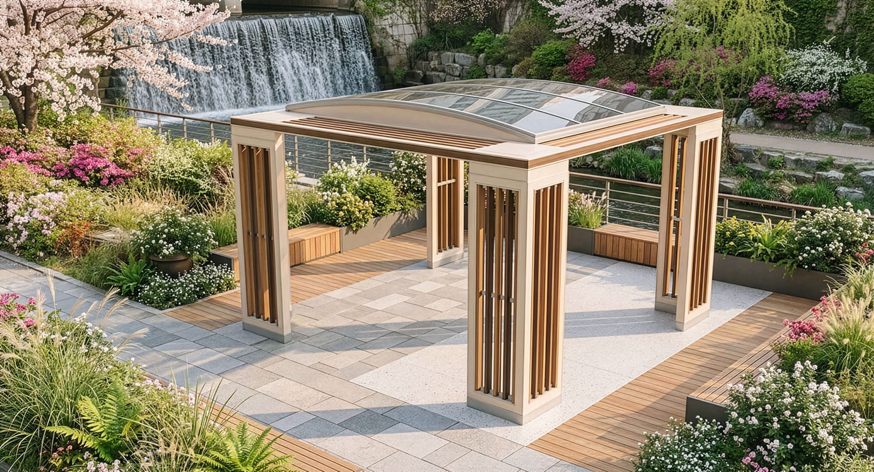 아치 그리드 베이직(ARCH-GRID BASIC)|DAUM-P-1183 제품목록으로 바로가기 자료 및 바로가기 나라장터 바로연결 도면 다운로드 시공사진 보러가기 기타 세련된 화이트 프레임과 아치형 그리드 루프가 어우러져 경쾌하고 입체적인 조형미를 선사합니다. 기둥과 루프에 적용된 목재 루버 패턴이 시각적 안정감을 더하며, 투명한 폴리카보네이트를 통해 유입되는 풍부한 채광이 안락한 휴식 공간을 완성합니다. 제품명 아치 그리드 베이직(ARCH-GRID BASIC)|DAUM-P-1183 물품식별번호 25018104 규격 4,000 X 4,000 X 2,800(H) 재질 stl, galvanized, hard wood, polycarbonate, hpl 아치 그리드 베이직(ARCH-GRID BASIC)|DAUM-P-1183 물품식별번호 25018104 규격 4,000 X 4,000 X 2,800(H) 재질 stl, galvanized, hard wood, polycarbonate, hpl 기타 세련된 화이트 프레임과 아치형 그리드 루프가 어우러져 경쾌하고 입체적인 조형미를 선사합니다. 기둥과 루프에 적용된 목재 루버 패턴이 시각적 안정감을 더하며, 투명한 폴리카보네이트를 통해 유입되는 풍부한 채광이 안락한 휴식 공간을 완성합니다. 자료 및 바로가기 나라장터 바로연결 도면 다운로드 시공사진 보러가기