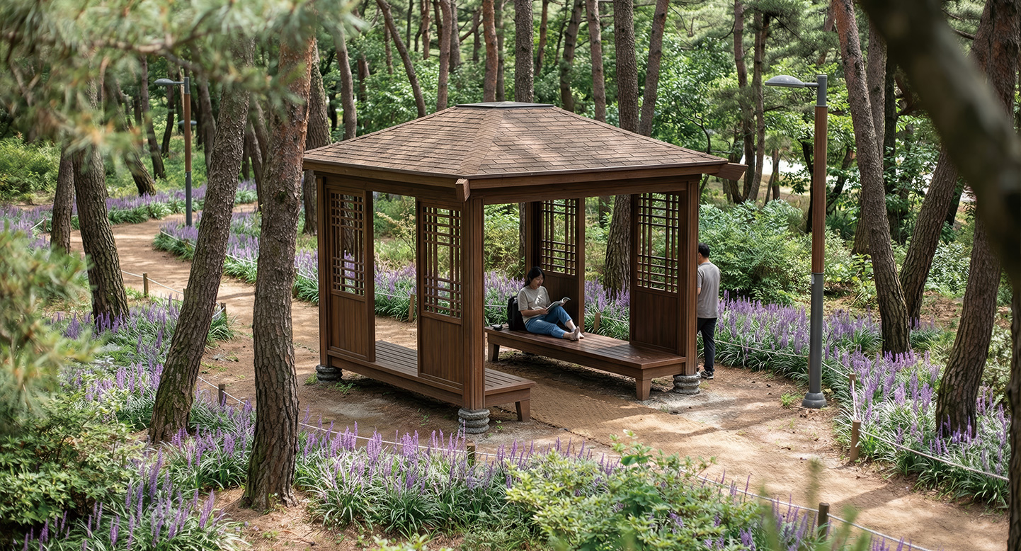 팀버 위브(TIMBER WEAVE)|DAUM-P-138 제품목록으로 바로가기 자료 및 바로가기 나라장터 바로연결 도면 다운로드 시공사진 보러가기 기타 나무를 한 올 한 올 엮어 만든 듯한 섬세한 직조(Weave) 패턴이 돋보입니다. 공예적인 디테일이 따뜻하고 아늑한 분위기를 연출하며, 패턴 사이로 투과되는 빛과 그림자가 아름다운 공간을 만들어냅니다. 제품명 팀버 위브(TIMBER WEAVE)|DAUM-P-138 물품식별번호 23142060 규격 4,300 X 4,300 X 3,440(H) 재질 stl, hard wood, asphalt shingle, polycarbonate, 화강석 팀버 위브(TIMBER WEAVE)|DAUM-P-138 물품식별번호 23142060 규격 4,300 X 4,300 X 3,440(H) 재질 stl, hard wood, asphalt shingle, polycarbonate, 화강석 기타 나무를 한 올 한 올 엮어 만든 듯한 섬세한 직조(Weave) 패턴이 돋보입니다. 공예적인 디테일이 따뜻하고 아늑한 분위기를 연출하며, 패턴 사이로 투과되는 빛과 그림자가 아름다운 공간을 만들어냅니다. 자료 및 바로가기 나라장터 바로연결 도면 다운로드 시공사진 보러가기