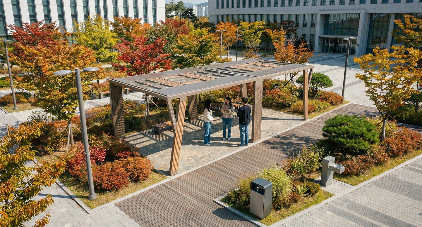 내추럴 브레이스 홀(NATURAL BRACE HALL)|DAUM-P-1786 제품목록으로 바로가기 자료 및 바로가기 나라장터 바로연결 도면 다운로드 시공사진 보러가기 기타 기울어진 우드 기둥이 나뭇가지의 형태를 연상시키는 사각 대형 라운지로, 비스듬한 지붕과 빗살 패턴이 어우러져 숲 속 산책로에 자연스러운 쉼의 흐름을 만든다. 제품명 내추럴 브레이스 홀(NATURAL BRACE HALL)|DAUM-P-1786 물품식별번호 25671848 규격 8,000 X 4,000 X 2,765(H) 재질 stl, galvanized, hard wood, polycarbonate, hpl 내추럴 브레이스 홀(NATURAL BRACE HALL)|DAUM-P-1786 물품식별번호 25671848 규격 8,000 X 4,000 X 2,765(H) 재질 stl, galvanized, hard wood, polycarbonate, hpl 기타 기울어진 우드 기둥이 나뭇가지의 형태를 연상시키는 사각 대형 라운지로, 비스듬한 지붕과 빗살 패턴이 어우러져 숲 속 산책로에 자연스러운 쉼의 흐름을 만든다. 자료 및 바로가기 나라장터 바로연결 도면 다운로드 시공사진 보러가기