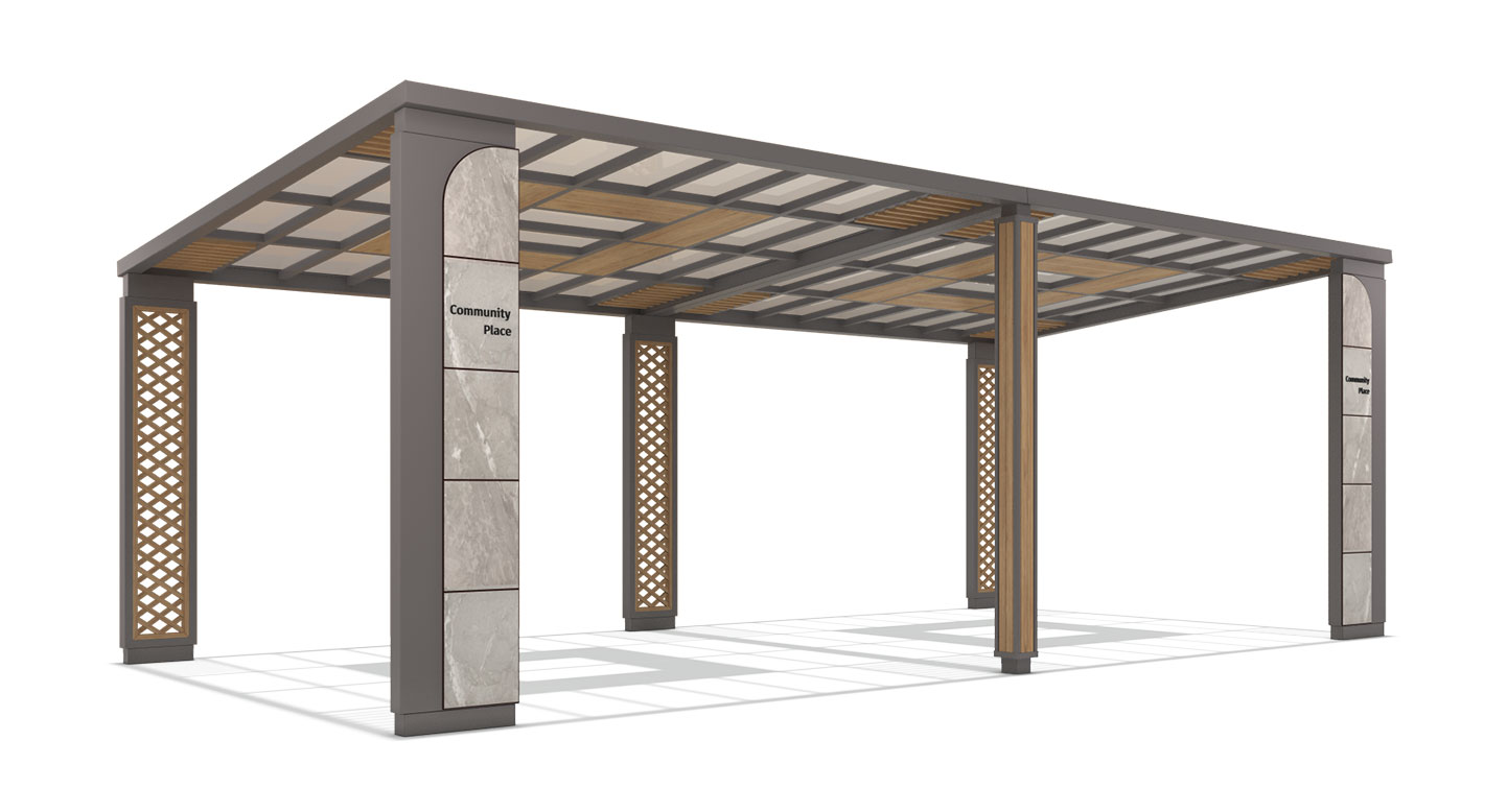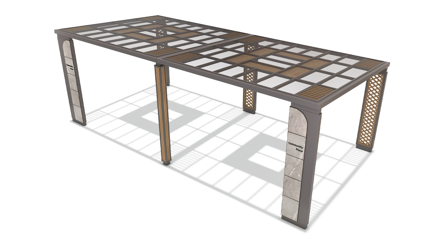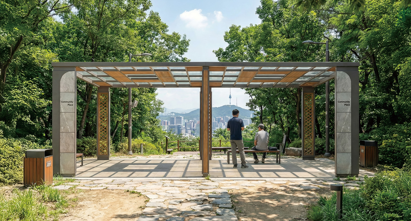 크로스 스톤 홀(CROSS STONE HALL)|DAUM-P-1785 제품목록으로 바로가기 자료 및 바로가기 나라장터 바로연결 도면 다운로드 시공사진 보러가기 기타 사선으로 교차된 우드 패턴과 스톤 질감 기둥이 구조적 리듬을 형성하는 사각 대형 퍼걸러로, 단지 산책로와 휴식 공간에서 모던한 쉼의 중심을 만든다. 제품명 크로스 스톤 홀(CROSS STONE HALL)|DAUM-P-1785 물품식별번호 25671847 규격 8,000 X 4,000 X 2,765(H) 재질 stl, galvanized, hard wood, polycarbonate, hpl 크로스 스톤 홀(CROSS STONE HALL)|DAUM-P-1785 물품식별번호 25671847 규격 8,000 X 4,000 X 2,765(H) 재질 stl, galvanized, hard wood, polycarbonate, hpl 기타 사선으로 교차된 우드 패턴과 스톤 질감 기둥이 구조적 리듬을 형성하는 사각 대형 퍼걸러로, 단지 산책로와 휴식 공간에서 모던한 쉼의 중심을 만든다. 자료 및 바로가기 나라장터 바로연결 도면 다운로드 시공사진 보러가기