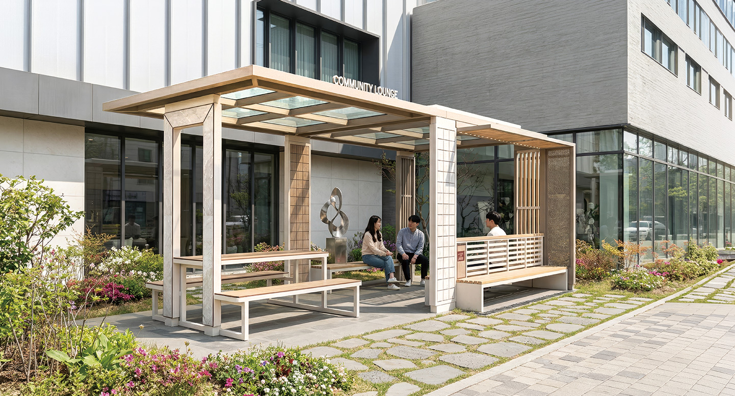 노블커뮤니티 홀 프라임(NOBLE-COMMUNITY HALL PRIME)|DAUM-P-2720 제품목록으로 바로가기 자료 및 바로가기 나라장터 바로연결 도면 다운로드 시공사진 보러가기 기타 화이트 대리석 패턴의 포인트 기둥이 고급스러운 무드를 자아내며, 테이블과 벤치가 결합된 실용적인 구성이 돋보입니다. 이웃과 소통하는 커뮤니티 라운지로 활용되어 주거 단지의 품격을 높여주는 럭셔리 쉼터입니다. 제품명 노블커뮤니티 홀 프라임(NOBLE-COMMUNITY HALL PRIME)|DAUM-P-2720 물품식별번호 25939120 규격 7,000 × 3,500 × 2,750(H) 재질 stl, galvanized, hard wood, polycarbonate, hpl 노블커뮤니티 홀 프라임(NOBLE-COMMUNITY HALL PRIME)|DAUM-P-2720 물품식별번호 25939120 규격 7,000 × 3,500 × 2,750(H) 재질 stl, galvanized, hard wood, polycarbonate, hpl 기타 화이트 대리석 패턴의 포인트 기둥이 고급스러운 무드를 자아내며, 테이블과 벤치가 결합된 실용적인 구성이 돋보입니다. 이웃과 소통하는 커뮤니티 라운지로 활용되어 주거 단지의 품격을 높여주는 럭셔리 쉼터입니다. 자료 및 바로가기 나라장터 바로연결 도면 다운로드 시공사진 보러가기