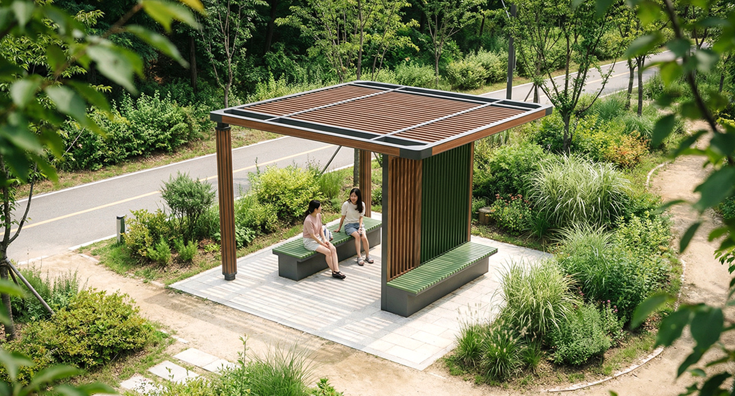 그린 라운지 플러스(GREEN LOUNGE PLUS)|DAUM-P-1143 제품목록으로 바로가기 자료 및 바로가기 나라장터 바로연결 도면 다운로드 시공사진 보러가기 기타 중후한 차콜 프레임과 그린 루버 패널이 조화를 이루어 도심 속 자연스러운 쉼터를 연출합니다. 루프와 연결된 파티션 월을 중심으로 평상과 벤치를 분리 설계하여, 한 공간에서 다양한 방식의 프리미엄 휴식을 제공합니다. 제품명 그린 라운지 플러스(GREEN LOUNGE PLUS)|DAUM-P-1143 물품식별번호 25018048 규격 4,000 X 4,000 X 2,600(H) 재질 stl, galvanized, hard wood, polycarbonate, hpl 그린 라운지 플러스(GREEN LOUNGE PLUS)|DAUM-P-1143 물품식별번호 25018048 규격 4,000 X 4,000 X 2,600(H) 재질 stl, galvanized, hard wood, polycarbonate, hpl 기타 중후한 차콜 프레임과 그린 루버 패널이 조화를 이루어 도심 속 자연스러운 쉼터를 연출합니다. 루프와 연결된 파티션 월을 중심으로 평상과 벤치를 분리 설계하여, 한 공간에서 다양한 방식의 프리미엄 휴식을 제공합니다. 자료 및 바로가기 나라장터 바로연결 도면 다운로드 시공사진 보러가기