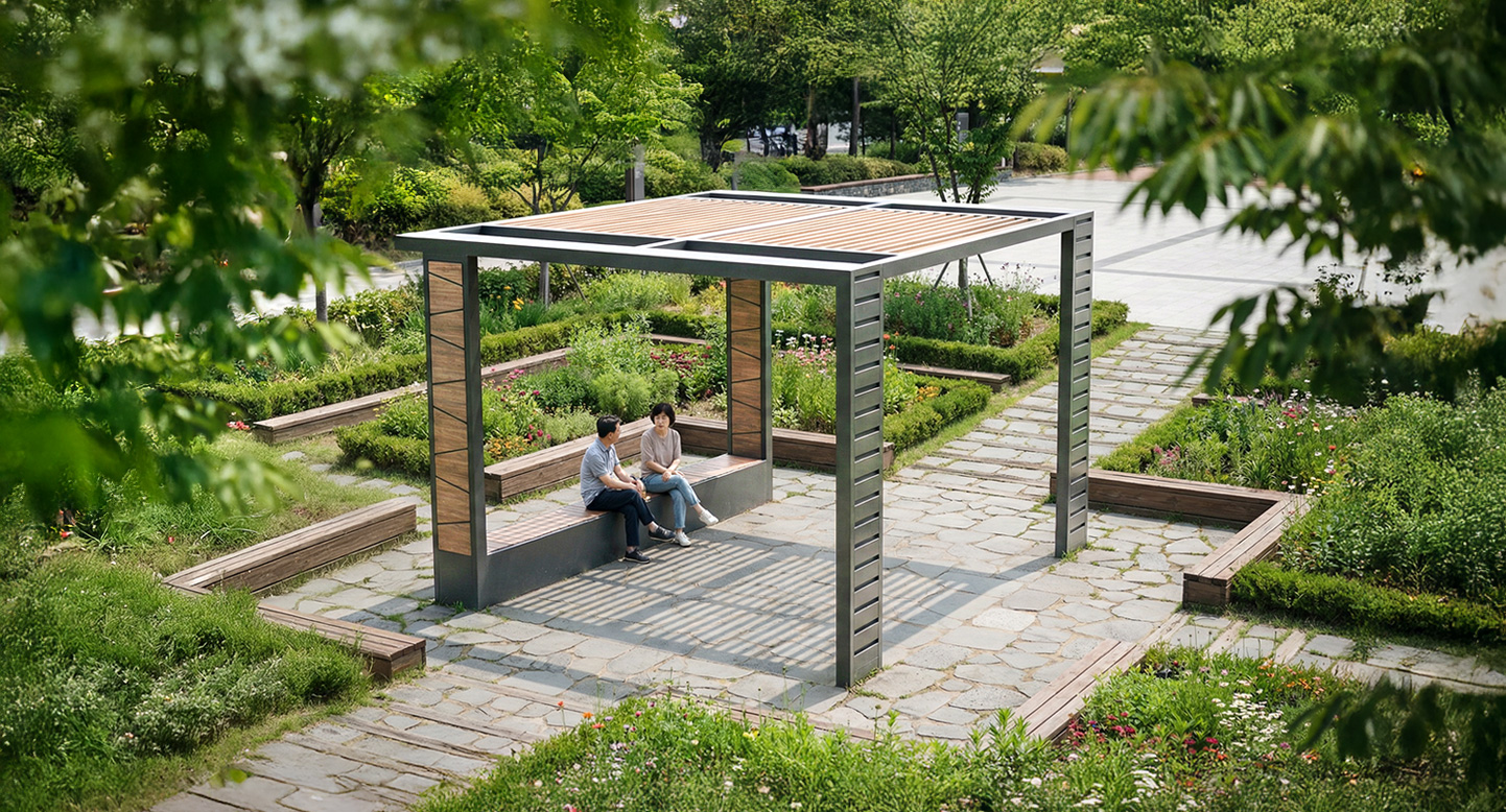 어반 스트라이프 플러스(URBAN STRIPE PLUS)|DAUM-P-119 제품목록으로 바로가기 자료 및 바로가기 나라장터 바로연결 도면 다운로드 시공사진 보러가기 기타 기둥 전면에 적용된 섬세한 수평 슬릿 디테일과 배면 패널의 유니크한 사선 패턴이 조화를 이루어 감각적인 조형미를 선사합니다. 중후한 그레이 프레임에 내추럴 우드 루프와 일체형 벤치를 결합하여 단지 내 공간에 정갈하고 안락한 프리미엄 휴식처를 제공합니다. 제품명 어반 스트라이프 플러스(URBAN STRIPE PLUS)|DAUM-P-119 물품식별번호 23142039 규격 3,800 X 3,800 X 2,700(H) 재질 stl, galvanized, hard wood, polycarbonate 어반 스트라이프 플러스(URBAN STRIPE PLUS)|DAUM-P-119 물품식별번호 23142039 규격 3,800 X 3,800 X 2,700(H) 재질 stl, galvanized, hard wood, polycarbonate 기타 기둥 전면에 적용된 섬세한 수평 슬릿 디테일과 배면 패널의 유니크한 사선 패턴이 조화를 이루어 감각적인 조형미를 선사합니다. 중후한 그레이 프레임에 내추럴 우드 루프와 일체형 벤치를 결합하여 단지 내 공간에 정갈하고 안락한 프리미엄 휴식처를 제공합니다. 자료 및 바로가기 나라장터 바로연결 도면 다운로드 시공사진 보러가기