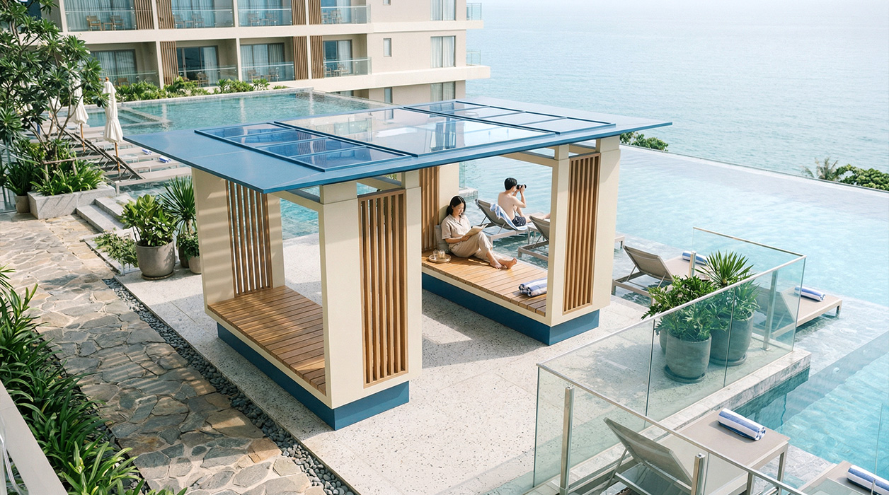 스카이 플로팅 홀 프라임 (SKY FLOATING HALL PRIME)|DAUM-P-1196 제품목록으로 바로가기 자료 및 바로가기 나라장터 바로연결 도면 다운로드 시공사진 보러가기 기타 청량한 블루 컬러의 루프와 베이지 톤의 묵직한 포스트가 결합되어 안정적이면서도 세련된 분위기를 연출합니다. 루프와 통합된 플로팅 스타일의 평상형 데크를 통해 지면으로부터 띄워진 쾌적한 휴식 공간을 제공합니다. 제품명 스카이 플로팅 홀 프라임 (SKY FLOATING HALL PRIME)|DAUM-P-1196 물품식별번호 25018131 규격 6,000 X 4,000 X 2,750(H) 재질 stl, galvanized, hard wood, polycarbonate 스카이 플로팅 홀 프라임 (SKY FLOATING HALL PRIME)|DAUM-P-1196 물품식별번호 25018131 규격 6,000 X 4,000 X 2,750(H) 재질 stl, galvanized, hard wood, polycarbonate 기타 청량한 블루 컬러의 루프와 베이지 톤의 묵직한 포스트가 결합되어 안정적이면서도 세련된 분위기를 연출합니다. 루프와 통합된 플로팅 스타일의 평상형 데크를 통해 지면으로부터 띄워진 쾌적한 휴식 공간을 제공합니다. 자료 및 바로가기 나라장터 바로연결 도면 다운로드 시공사진 보러가기