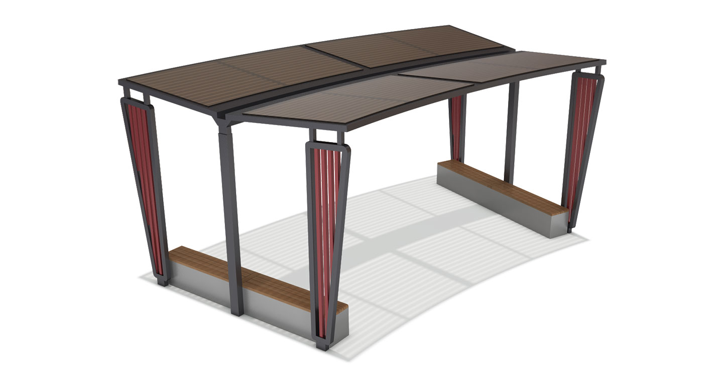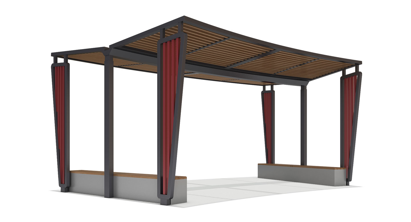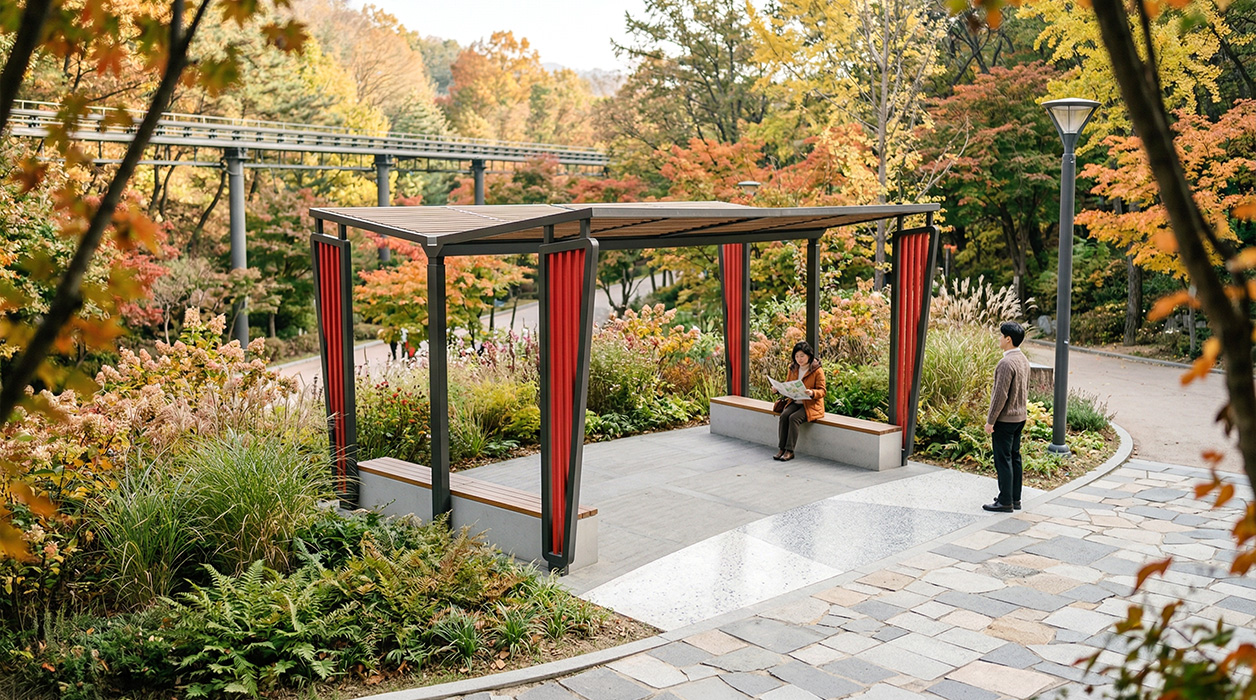 강렬한 레드 컬러의 조형 루버 포스트와 다크 그레이 프레임이 대비를 이루어 압도적인 존재감을 선사합니다. 광활한 인피니티급 오픈 프레임 아래 와이드 벤치를 배치하여, 단지 내 대규모 광장에서도 시원한 개방감과 여유로운 휴식 환경을 동시에 제공하는 프리미엄 커뮤니티 거점입니다.