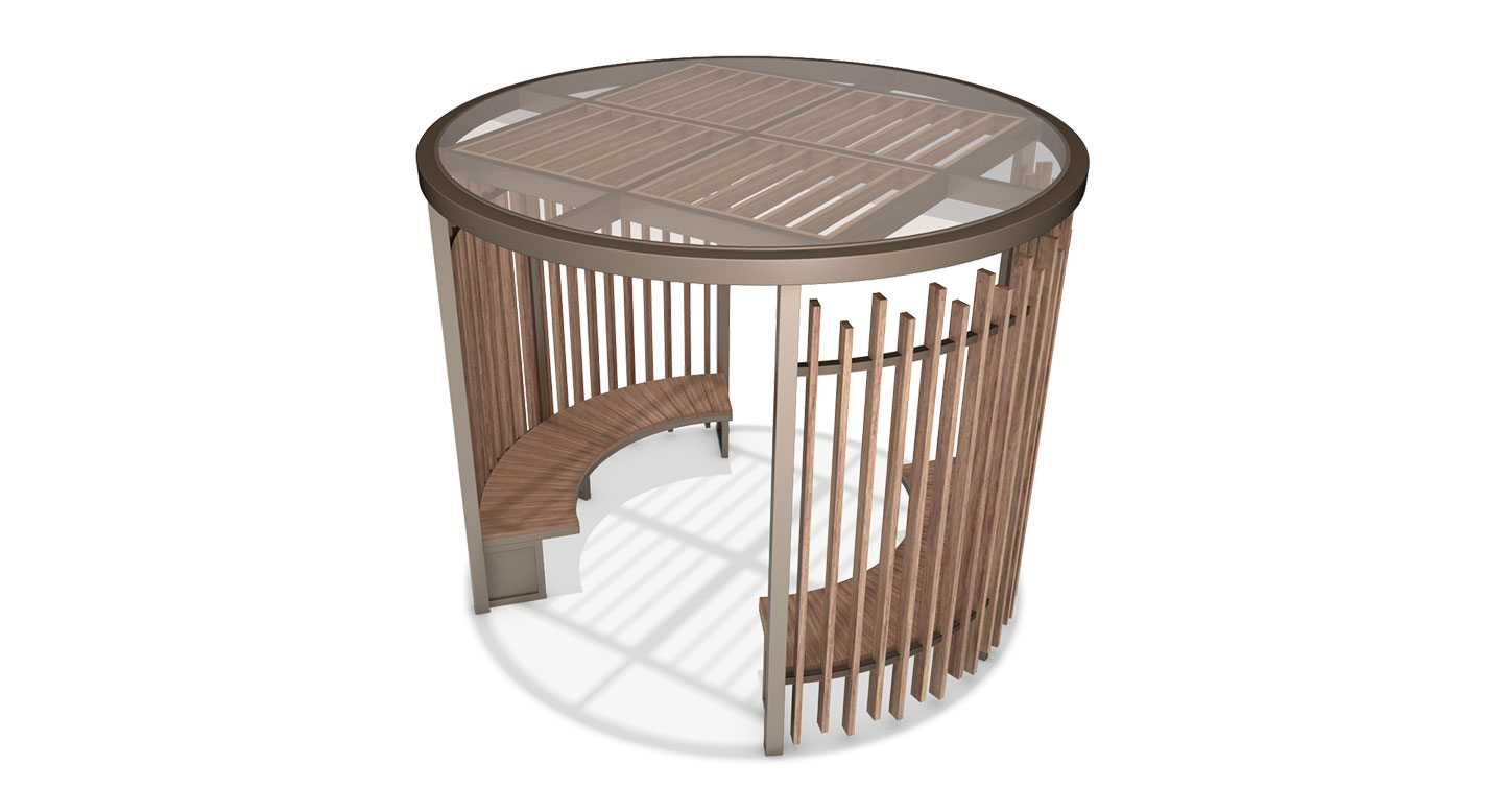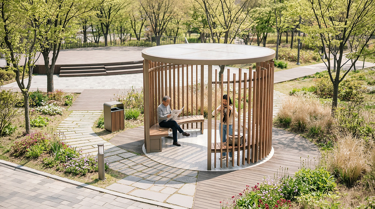 버티컬 우드 파티션 라운드(VERTICAL WOOD PARTITION ROUND)|DAUM-P-314 제품목록으로 바로가기 자료 및 바로가기 나라장터 바로연결 도면 다운로드 시공사진 보러가기 기타 높낮이가 다른 수직 우드 루버 파티션이 원형 루프를 감싸듯 배치되어 단아하고 리드미컬한 경관을 형성합니다. 루프 내부의 우드 루버와 하부 곡선 벤치가 통일감을 주어 단지 내 숲속 정원처럼 아늑하고 따뜻한 쉼터를 제공합니다. 제품명 버티컬 우드 파티션 라운드(VERTICAL WOOD PARTITION ROUND)|DAUM-P-314 물품식별번호 25018208 규격 3,000 X 3,000 X 2,400(H) 재질 stl, hard wood, galvanized, polycarbonate 버티컬 우드 파티션 라운드(VERTICAL WOOD PARTITION ROUND)|DAUM-P-314 물품식별번호 25018208 규격 3,000 X 3,000 X 2,400(H) 재질 stl, hard wood, galvanized, polycarbonate 기타 높낮이가 다른 수직 우드 루버 파티션이 원형 루프를 감싸듯 배치되어 단아하고 리드미컬한 경관을 형성합니다. 루프 내부의 우드 루버와 하부 곡선 벤치가 통일감을 주어 단지 내 숲속 정원처럼 아늑하고 따뜻한 쉼터를 제공합니다. 자료 및 바로가기 나라장터 바로연결 도면 다운로드 시공사진 보러가기