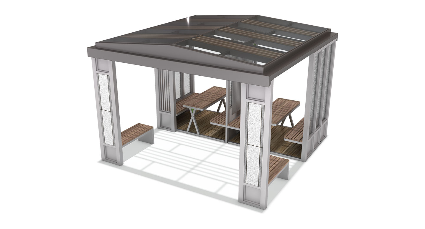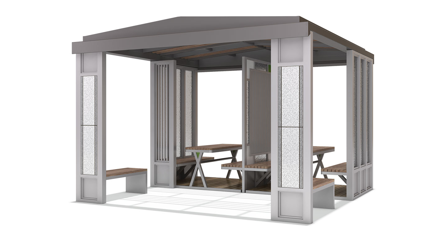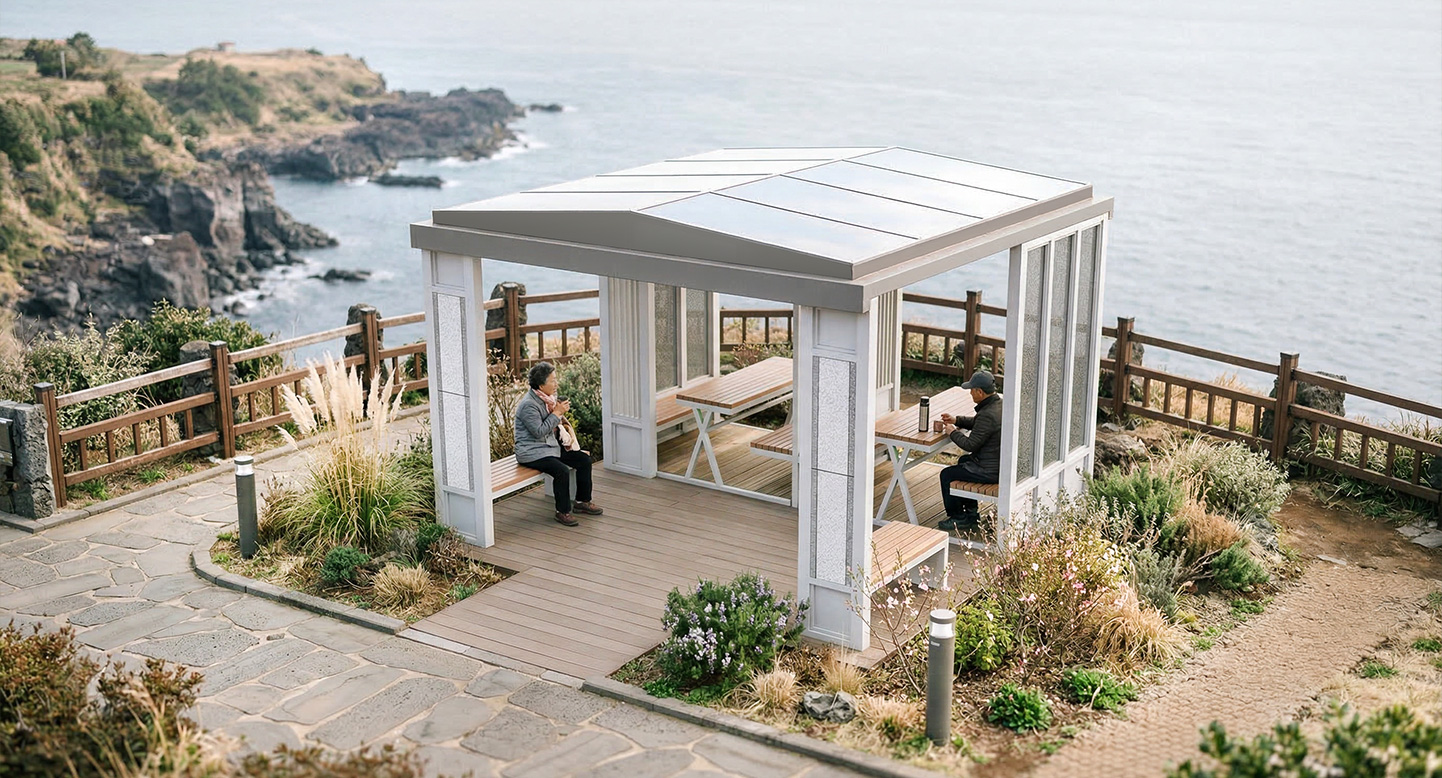 중후한 석재 패턴 패널과 세련된 화이트 프레임이 조화를 이루어 견고하고 현대적인 건축미를 선사합니다. 기둥의 모던한 포인트 조명과 내부의 대면형 테이블 세트, 그리고 목재 데크를 입체적으로 결합하여 단지 내 공간에 이웃과 소통하며 휴식할 수 있는 고품격 복합 쉼터를 제공합니다.