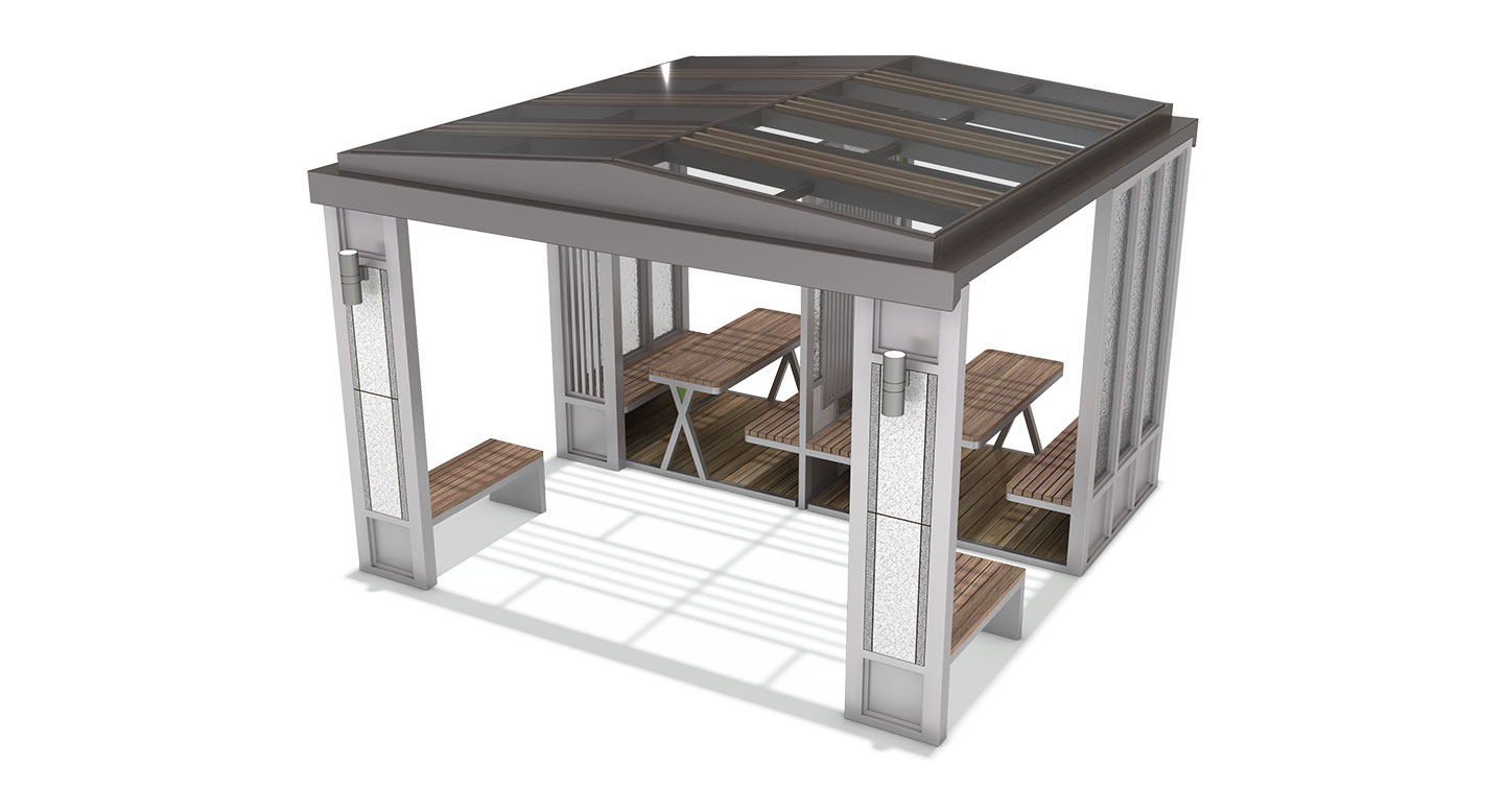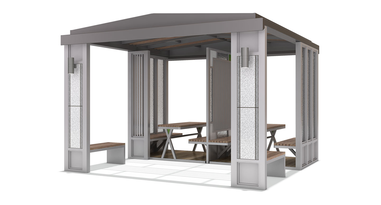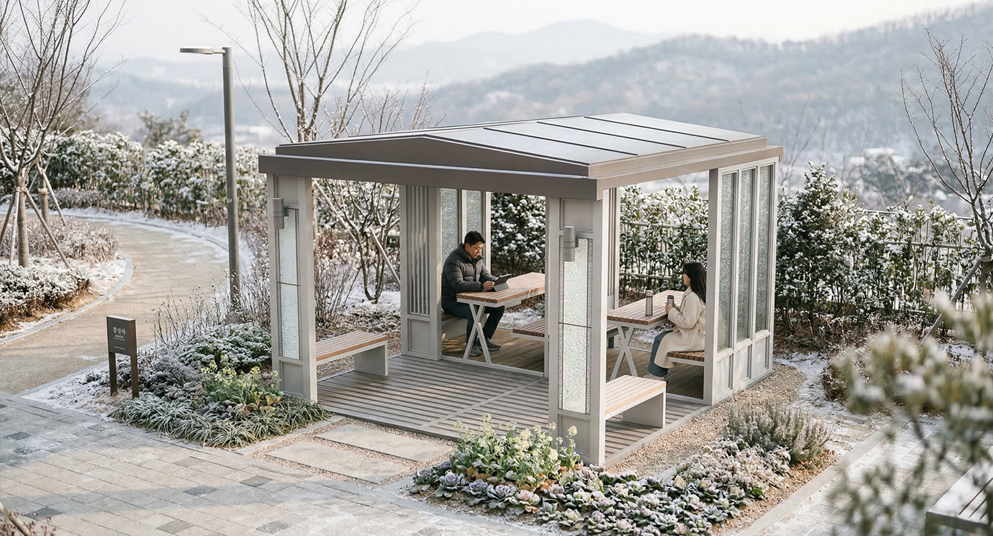 중후한 석재 패턴 패널과 세련된 화이트 프레임이 조화를 이루어 견고하고 현대적인 건축미를 선사합니다. 기둥의 모던한 포인트 조명과 내부의 대면형 테이블 세트, 그리고 목재 데크를 입체적으로 결합하여 단지 내 공간에 이웃과 소통하며 휴식할 수 있는 고품격 복합 쉼터를 제공합니다.