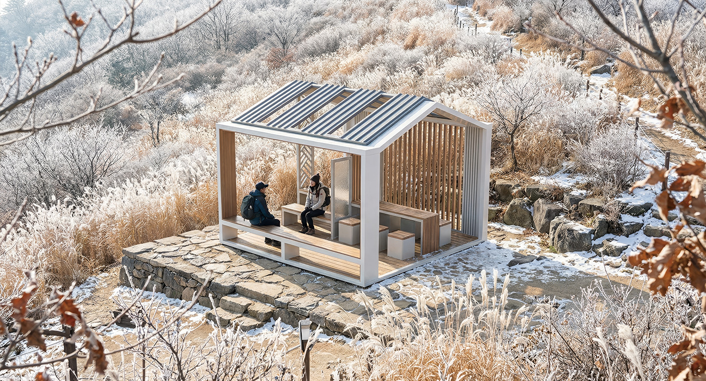 테라스 뷰 네스트(TERRACE VIEW NEST)|DAUM-P-182-1 제품목록으로 바로가기 자료 및 바로가기 나라장터 바로연결 도면 다운로드 시공사진 보러가기 기타 전면 오픈된 테라스형 구성이 시각적 개방감을 극대화하며, 바 테이블과 벤치가 공존하는 커뮤니티 중심의 고급 휴식 네스트입니다. 제품명 테라스 뷰 네스트(TERRACE VIEW NEST)|DAUM-P-182-1 물품식별번호 24551212 규격 4,000 X 4,000 X 3,260(H) 재질 stl, galvanized, hard wood, polycarbonate 테라스 뷰 네스트(TERRACE VIEW NEST)|DAUM-P-182-1 물품식별번호 24551212 규격 4,000 X 4,000 X 3,260(H) 재질 stl, galvanized, hard wood, polycarbonate 기타 전면 오픈된 테라스형 구성이 시각적 개방감을 극대화하며, 바 테이블과 벤치가 공존하는 커뮤니티 중심의 고급 휴식 네스트입니다. 자료 및 바로가기 나라장터 바로연결 도면 다운로드 시공사진 보러가기