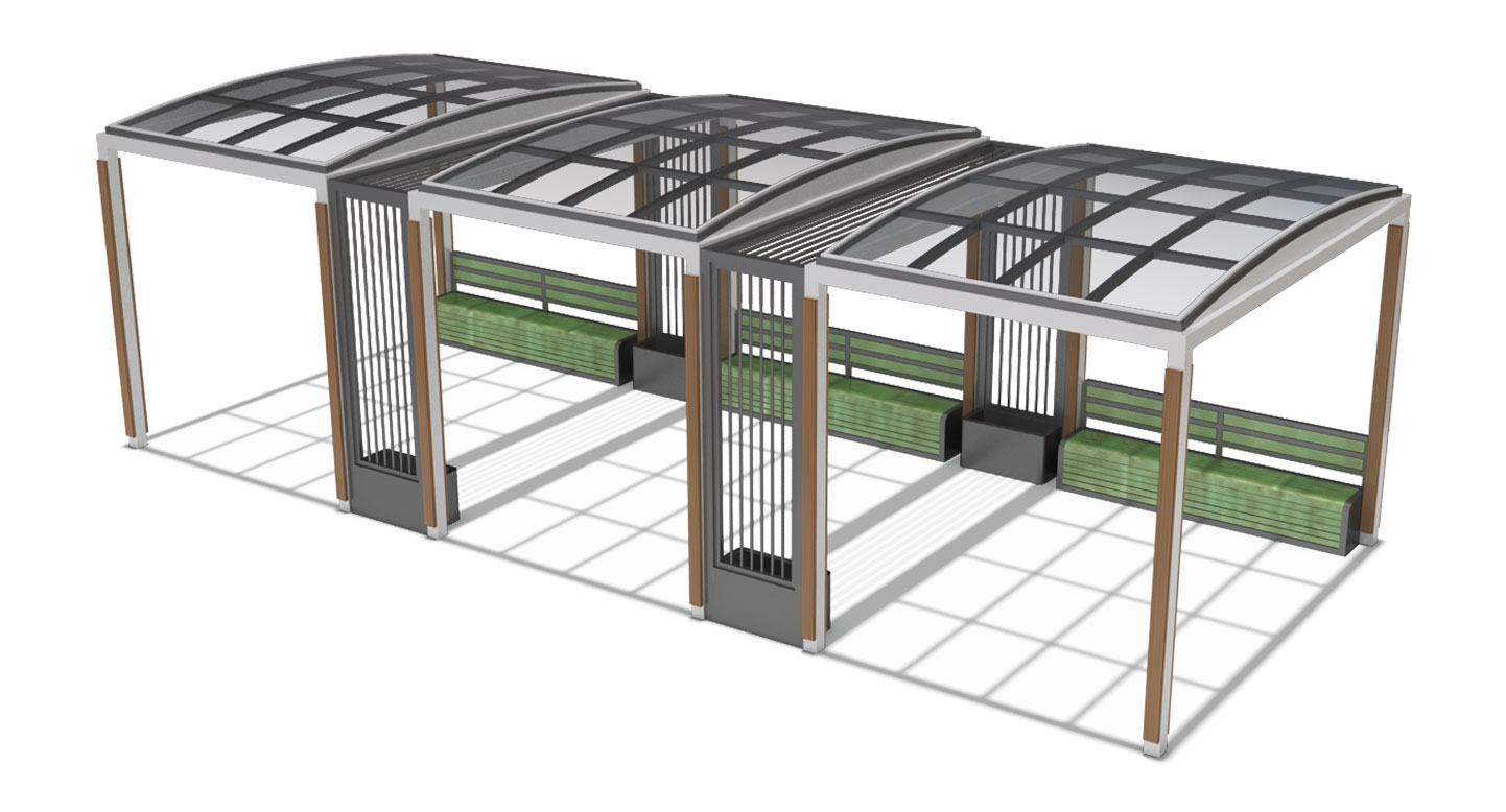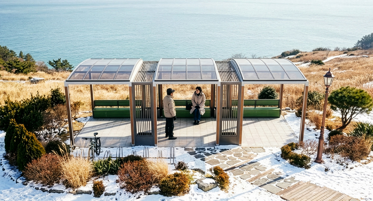 유연한 곡선의 아치형 루프가 반복되는 와이드 프레임과 싱그러운 그린 톤 벤치가 어우러져 웅장하고 쾌적한 경관을 연출합니다. 대규모 인원을 수용할 수 있는 긴 통합형 벤치와 정갈한 수직 루버 스크린을 통해 단지 내 메인 광장에 최적화된 고품격 프리미엄 복합 커뮤니티 공간을 제공합니다.