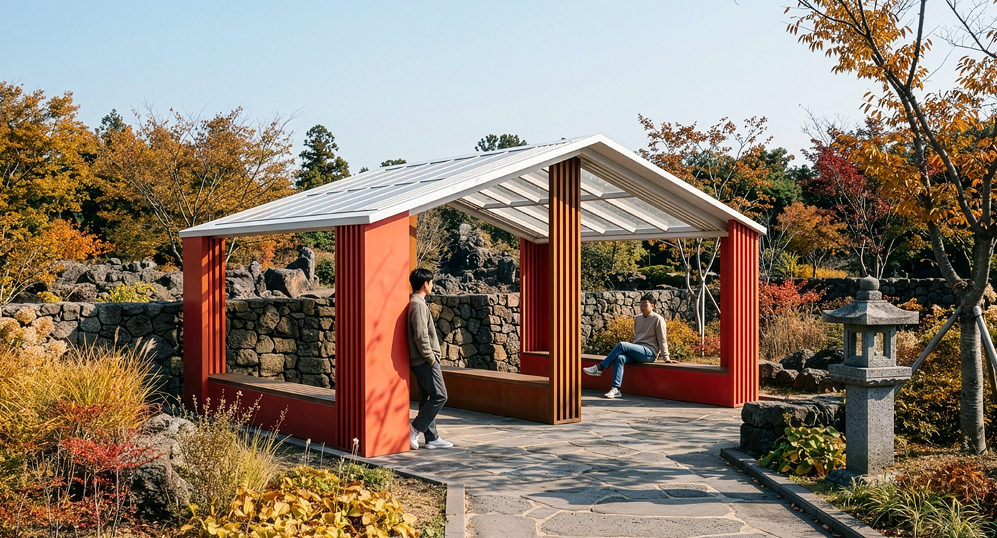 입체적인 박공 형태의 화이트 루프와 선명한 오렌지 월 프레임이 조화를 이루어 생동감 넘치는 경관을 연출합니다. 루프 아래 통합 설계된 긴 벤치와 정갈한 수직 루버를 통해, 단지 내 광장이나 휴게 거점에 다수가 머물며 소통할 수 있는 고품격 프리미엄 복합 쉼터를 제공합니다.