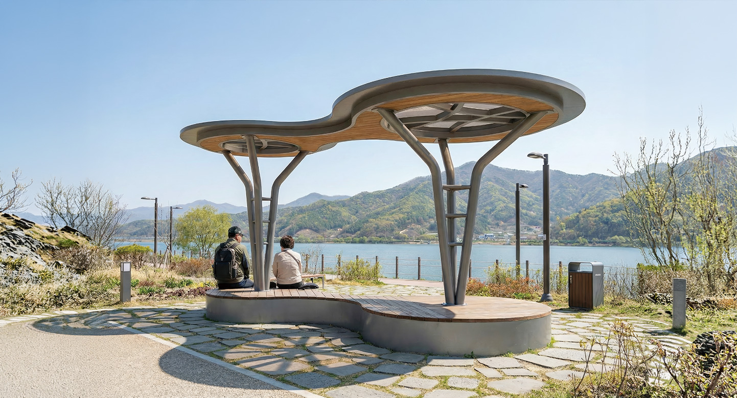 링크드 셀(LINKED CELL)|DAUM-P-301 제품목록으로 바로가기 자료 및 바로가기 나라장터 바로연결 도면 다운로드 시공사진 보러가기 기타 두 개의 원형 지붕과 하부 평상이 매끄러운 곡선으로 연결된 유기적 디자인입니다. 트러스 구조의 슬림한 기둥이 미래지향적인 분위기를 자아내며 공간에 리듬감을 부여하는 고감도 조형물입니다. 제품명 링크드 셀(LINKED CELL)|DAUM-P-301 물품식별번호 23142134 규격 5,000 X 2,600 X 2,692(H) 재질 stl, hard wood, galvanized, polycarbonate 링크드 셀(LINKED CELL)|DAUM-P-301 물품식별번호 23142134 규격 5,000 X 2,600 X 2,692(H) 재질 stl, hard wood, galvanized, polycarbonate 기타 두 개의 원형 지붕과 하부 평상이 매끄러운 곡선으로 연결된 유기적 디자인입니다. 트러스 구조의 슬림한 기둥이 미래지향적인 분위기를 자아내며 공간에 리듬감을 부여하는 고감도 조형물입니다. 자료 및 바로가기 나라장터 바로연결 도면 다운로드 시공사진 보러가기