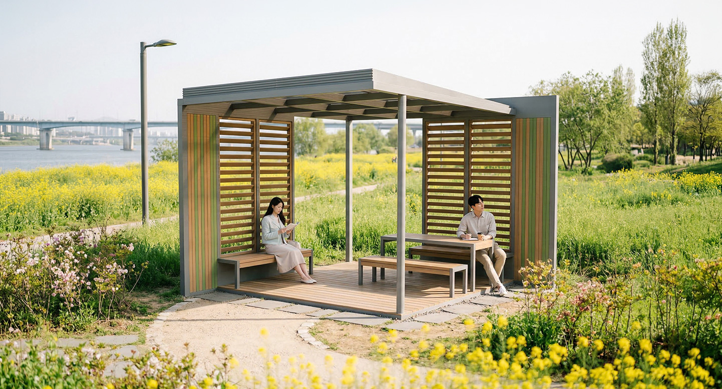 우드 라운지 플러스 (WOOD LOUNGE PLUS)DAUM-P-195 제품목록으로 바로가기 자료 및 바로가기 나라장터 바로연결 도면 다운로드 시공사진 보러가기 기타 와이드한 목재 데크와 루버 스크린이 어우러져 도심 속 아늑한 테라스 감성을 선사합니다. 세련된 그레이 프레임 아래로 등받이 벤치와 독립형 테이블 세트를 구성하여, 단지 내 휴게 공간에 소규모 모임과 휴식을 동시에 즐길 수 있는 프리미엄 오픈 라운지를 제공합니다. 제품명 우드 라운지 플러스 (WOOD LOUNGE PLUS)DAUM-P-195 물품식별번호 25017782 규격 4,000 X 4,000 X 2,900(H) 재질 stl, galvanized, hard wood, polycarbonate 우드 라운지 플러스 (WOOD LOUNGE PLUS)DAUM-P-195 물품식별번호 25017782 규격 4,000 X 4,000 X 2,900(H) 재질 stl, galvanized, hard wood, polycarbonate 기타 와이드한 목재 데크와 루버 스크린이 어우러져 도심 속 아늑한 테라스 감성을 선사합니다. 세련된 그레이 프레임 아래로 등받이 벤치와 독립형 테이블 세트를 구성하여, 단지 내 휴게 공간에 소규모 모임과 휴식을 동시에 즐길 수 있는 프리미엄 오픈 라운지를 제공합니다. 자료 및 바로가기 나라장터 바로연결 도면 다운로드 시공사진 보러가기