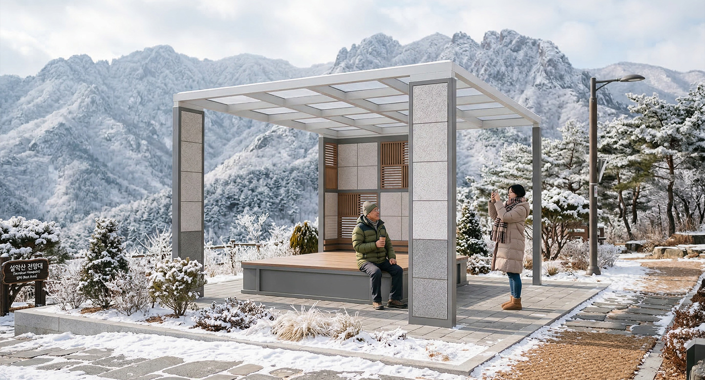 아트월 갤러리 쉘터(ART-WALL GALLERY SHELTER)|DAUM-P-185B 제품목록으로 바로가기 자료 및 바로가기 나라장터 바로연결 도면 다운로드 시공사진 보러가기 기타 와이드한 석재 패턴 포스트와 배면의 체크형 아트월이 어우러져 현대적이고 견고한 갤러리 감성을 연출합니다. 세련된 화이트 프레임 루프 아래 광폭 목재 평상을 배치하여, 단지 내 휴게 공간에 전통적인 편안함과 모던한 미감을 동시에 갖춘 프리미엄 쉼터를 제공합니다. 제품명 아트월 갤러리 쉘터(ART-WALL GALLERY SHELTER)|DAUM-P-185B 물품식별번호 24538217 규격 3,800 X 3,800 X 2,700(H) 재질 stl, galvanized, hard wood, polycarbonate 아트월 갤러리 쉘터(ART-WALL GALLERY SHELTER)|DAUM-P-185B 물품식별번호 24538217 규격 3,800 X 3,800 X 2,700(H) 재질 stl, galvanized, hard wood, polycarbonate 기타 와이드한 석재 패턴 포스트와 배면의 체크형 아트월이 어우러져 현대적이고 견고한 갤러리 감성을 연출합니다. 세련된 화이트 프레임 루프 아래 광폭 목재 평상을 배치하여, 단지 내 휴게 공간에 전통적인 편안함과 모던한 미감을 동시에 갖춘 프리미엄 쉼터를 제공합니다. 자료 및 바로가기 나라장터 바로연결 도면 다운로드 시공사진 보러가기