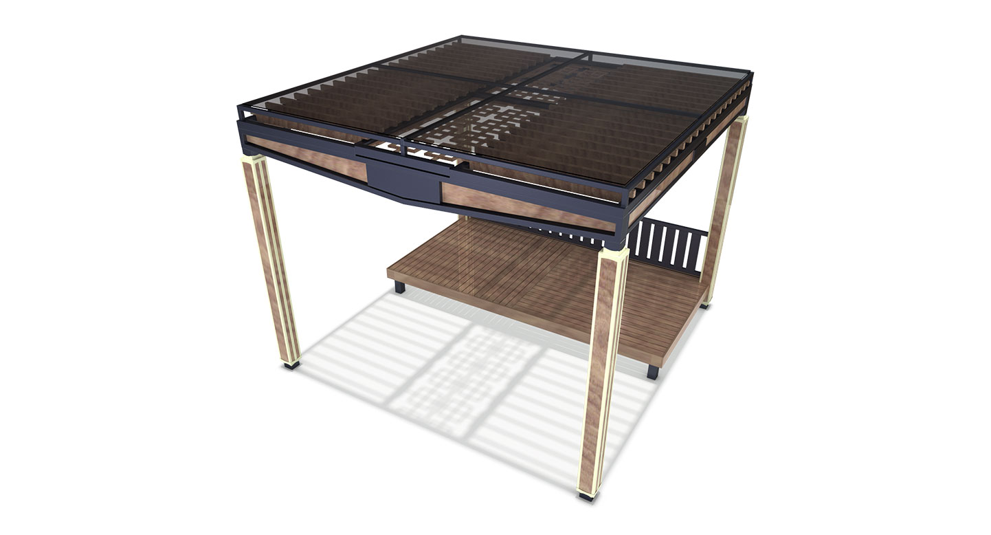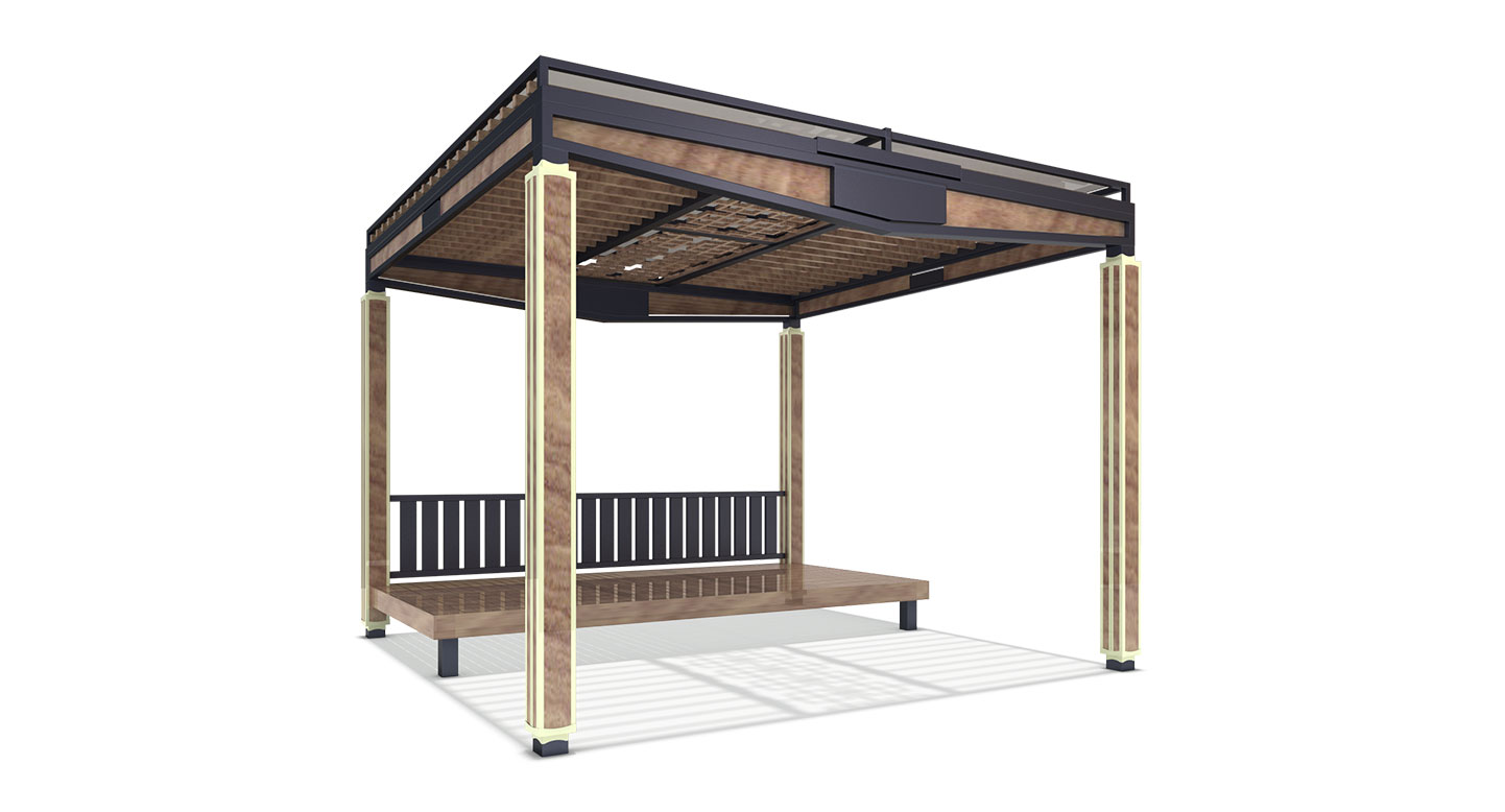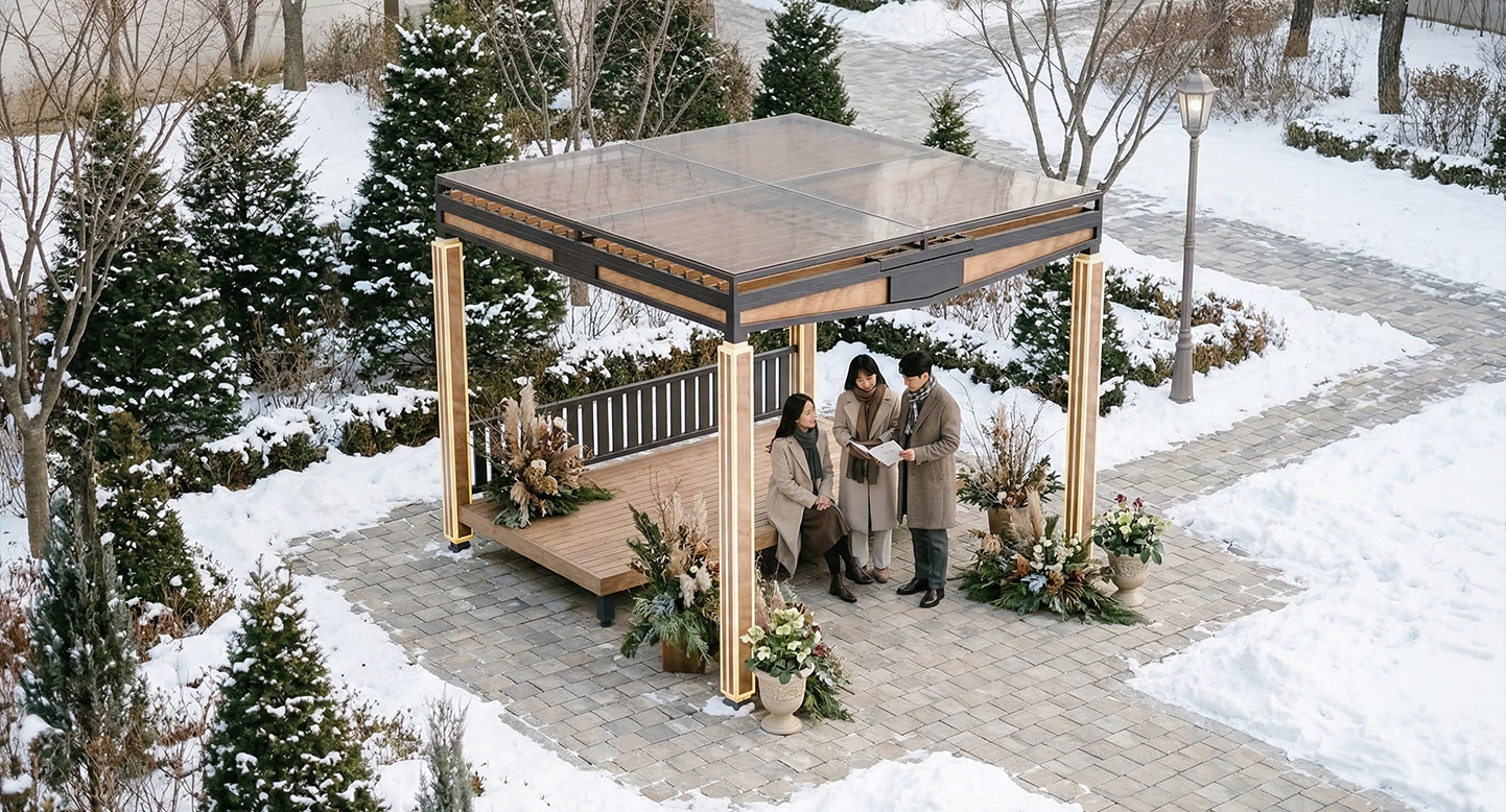 사각 기둥 모서리를 따라 흐르는 수직 라인 조명이 야간 경관에 은은하고 고급스러운 분위기를 더해줍니다. 다크 그레이의 견고한 상부 프레임과 목재의 따뜻한 질감이 어우러진 넓은 평상을 통해, 단지 내 휴게 공간에 전통과 현대가 공존하는 격조 높은 프리미엄 쉼터를 제공합니다.