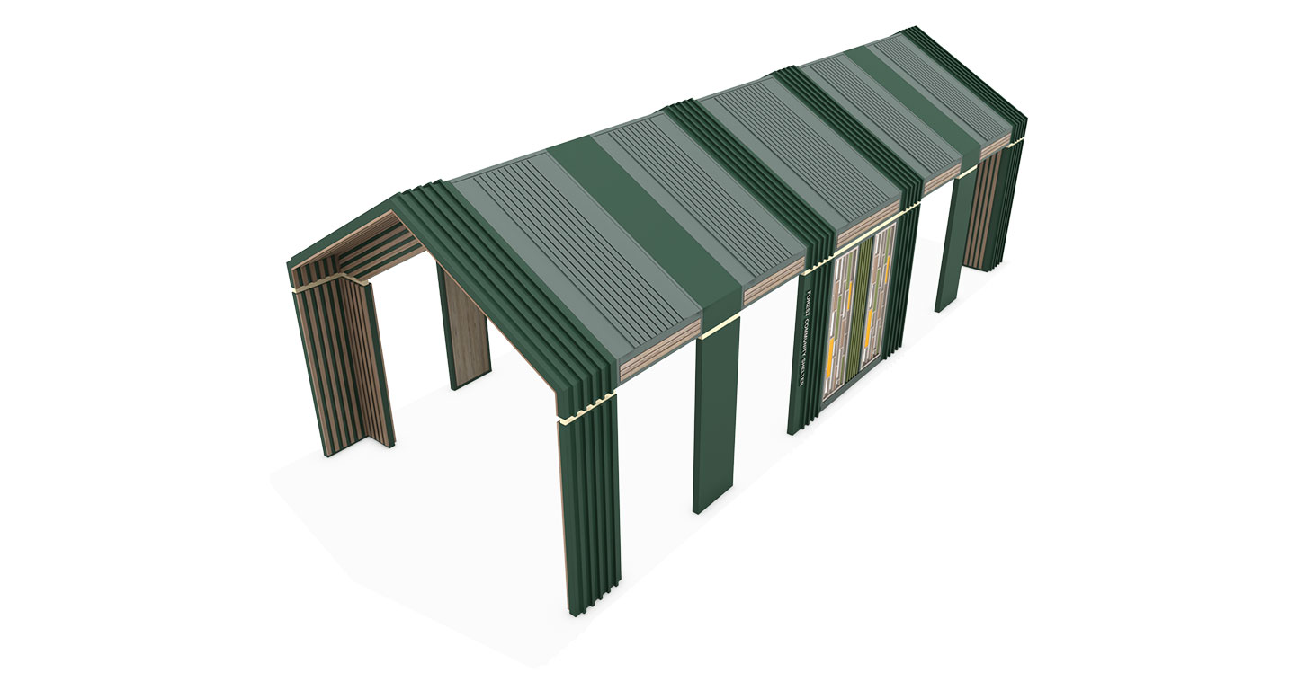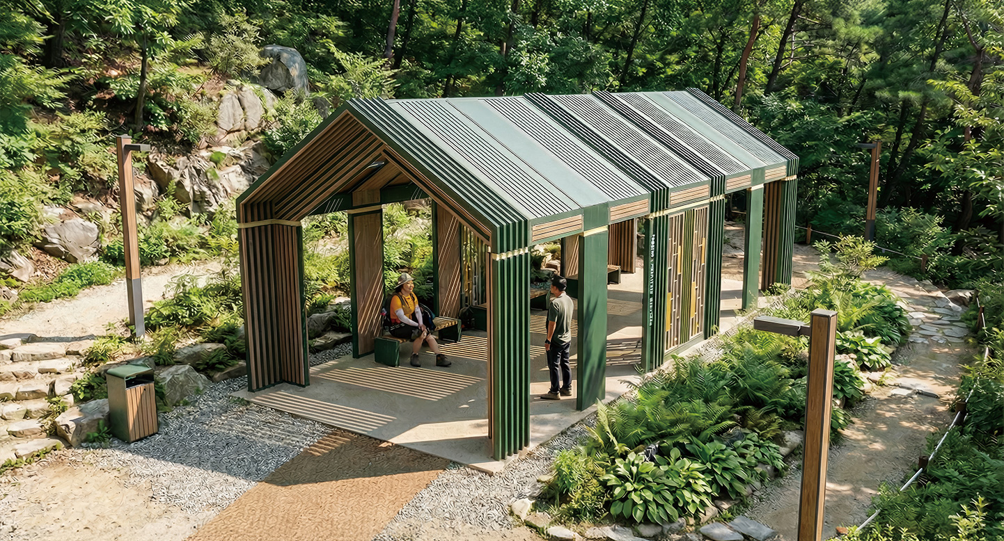 트라이프 테라스 홀(TRIPE TERRACE HALL)|DAUM-P-2768 제품목록으로 바로가기 자료 및 바로가기 나라장터 바로연결 도면 다운로드 시공사진 보러가기 기타 박공 지붕 아래 하나의 ‘열린 홀’ 같은 공간을 구성한 대형 기본형 모델입니다. 딥그린 컬러와 모자이크 패턴 포인트가 자연 환경과 조화롭게 어우러지며, 야외 학습·운동·커뮤니티 활동을 유연하게 수용하는 심플 모던 쉘터로 계획되었습니다. 제품명 트라이프 테라스 홀(TRIPE TERRACE HALL)|DAUM-P-2768 물품식별번호 25939660 규격 13,000X 5,000 X 4,373(H) 재질 stl, galvanized, hard wood, polycarbonate, hpl 트라이프 테라스 홀(TRIPE TERRACE HALL)|DAUM-P-2768 물품식별번호 25939660 규격 13,000X 5,000 X 4,373(H) 재질 stl, galvanized, hard wood, polycarbonate, hpl 기타 박공 지붕 아래 하나의 ‘열린 홀’ 같은 공간을 구성한 대형 기본형 모델입니다. 딥그린 컬러와 모자이크 패턴 포인트가 자연 환경과 조화롭게 어우러지며, 야외 학습·운동·커뮤니티 활동을 유연하게 수용하는 심플 모던 쉘터로 계획되었습니다. 자료 및 바로가기 나라장터 바로연결 도면 다운로드 시공사진 보러가기