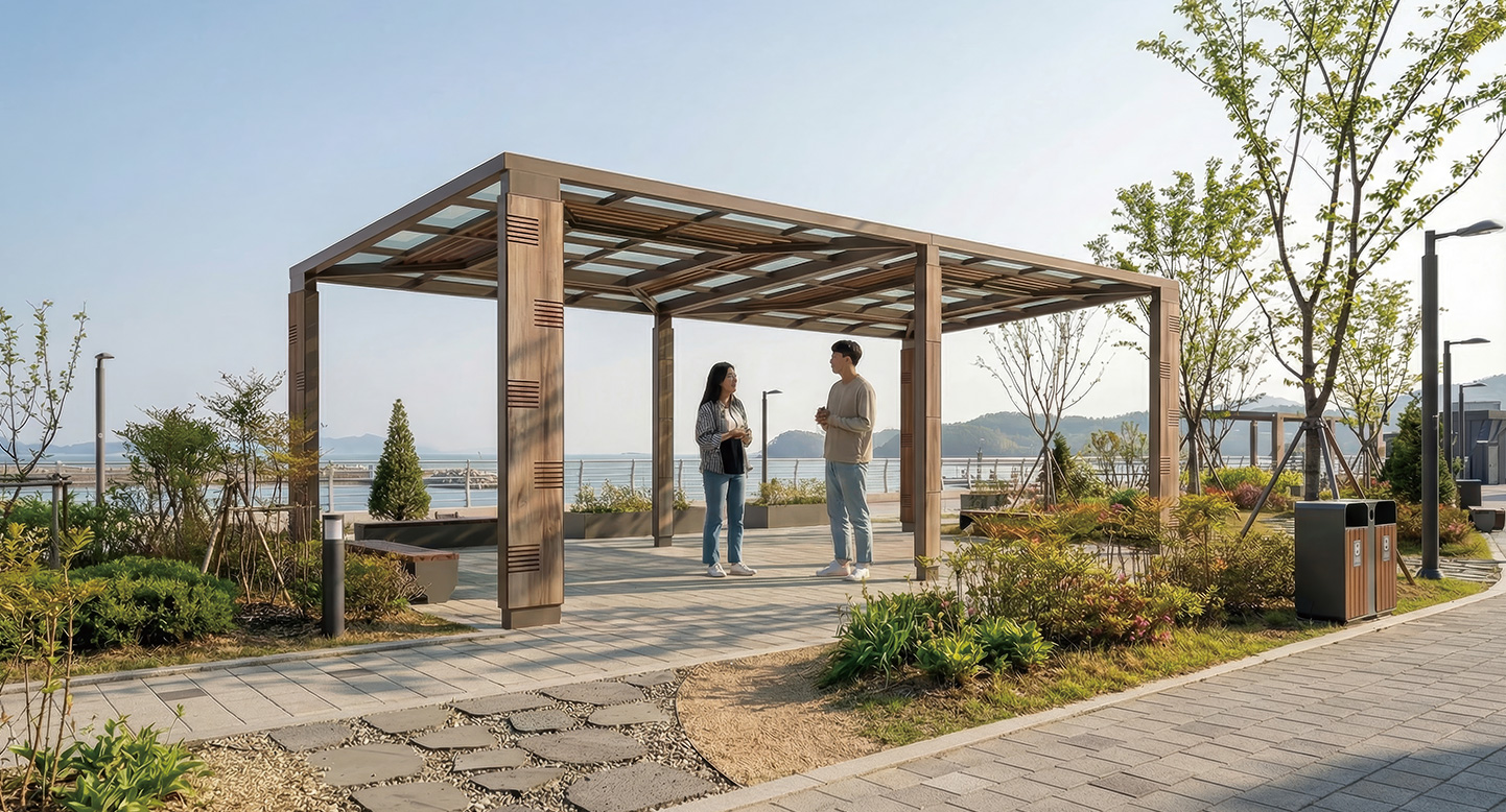 듀얼 액시스 홀(DUAL AXIS HALL)|DAUM-P-2703 제품목록으로 바로가기 자료 및 바로가기 나라장터 바로연결 도면 다운로드 시공사진 보러가기 기타 중심과 외곽으로 분리된 기둥 배치와 비스듬한 사각 지붕이 두 개의 축을 만들며, 단지 내 산책 동선에서 방향성과 구조미를 강조하는 모던 쉘터입니다. 제품명 듀얼 액시스 홀(DUAL AXIS HALL)|DAUM-P-2703 물품식별번호 25671865 규격 7,600 X 3,800 X 2,800(H) 재질 stl, galvanized, hard wood, polycarbonate, hpl 듀얼 액시스 홀(DUAL AXIS HALL)|DAUM-P-2703 물품식별번호 25671865 규격 7,600 X 3,800 X 2,800(H) 재질 stl, galvanized, hard wood, polycarbonate, hpl 기타 중심과 외곽으로 분리된 기둥 배치와 비스듬한 사각 지붕이 두 개의 축을 만들며, 단지 내 산책 동선에서 방향성과 구조미를 강조하는 모던 쉘터입니다. 자료 및 바로가기 나라장터 바로연결 도면 다운로드 시공사진 보러가기