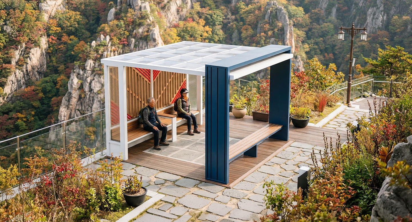블루 게이트 플러스(BLUE GATE PLUS)|DAUM-P-2102 제품목록으로 바로가기 자료 및 바로가기 나라장터 바로연결 도면 다운로드 시공사진 보러가기 기타 전면의 와이드한 블루 게이트 프레임이 공간에 상징적인 입구성과 청량감을 부여합니다. 화이트 배면 프레임 내부의 역동적인 사선 패턴 스크린과 일체형 벤치를 결합하여, 단지 내 휴게 공간에 감각적이고 안락한 프리미엄 쉼터를 제공합니다. 제품명 블루 게이트 플러스(BLUE GATE PLUS)|DAUM-P-2102 물품식별번호 25018139 규격 3,800 X 4,000 X 2,800(H) 재질 stl, galvanized, hard wood, polycarbonate 블루 게이트 플러스(BLUE GATE PLUS)|DAUM-P-2102 물품식별번호 25018139 규격 3,800 X 4,000 X 2,800(H) 재질 stl, galvanized, hard wood, polycarbonate 기타 전면의 와이드한 블루 게이트 프레임이 공간에 상징적인 입구성과 청량감을 부여합니다. 화이트 배면 프레임 내부의 역동적인 사선 패턴 스크린과 일체형 벤치를 결합하여, 단지 내 휴게 공간에 감각적이고 안락한 프리미엄 쉼터를 제공합니다. 자료 및 바로가기 나라장터 바로연결 도면 다운로드 시공사진 보러가기
