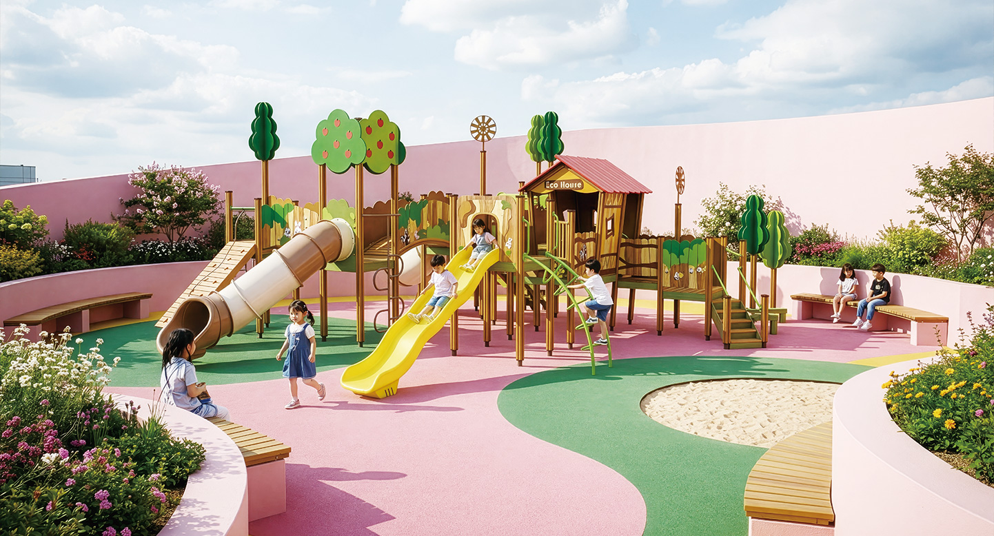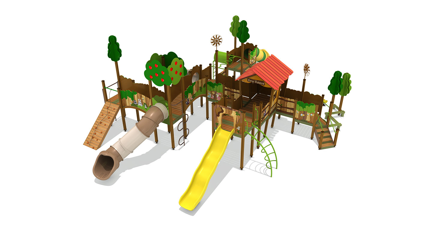 숲속마을의 랜드마크가 되는 대형 복합 놀이대입니다. 붉은 지붕의 에코 하우스와 풍성한 사과나무 타워가 구름다리로 연결되어 웅장함을 자랑합니다. 곳곳에 숨겨진 동물 친구들(토끼, 너구리) 그래픽과 다양한 슬라이드가 아이들에게 동화 속 주인공이 된듯한 환상적인 모험을 선사합니다.