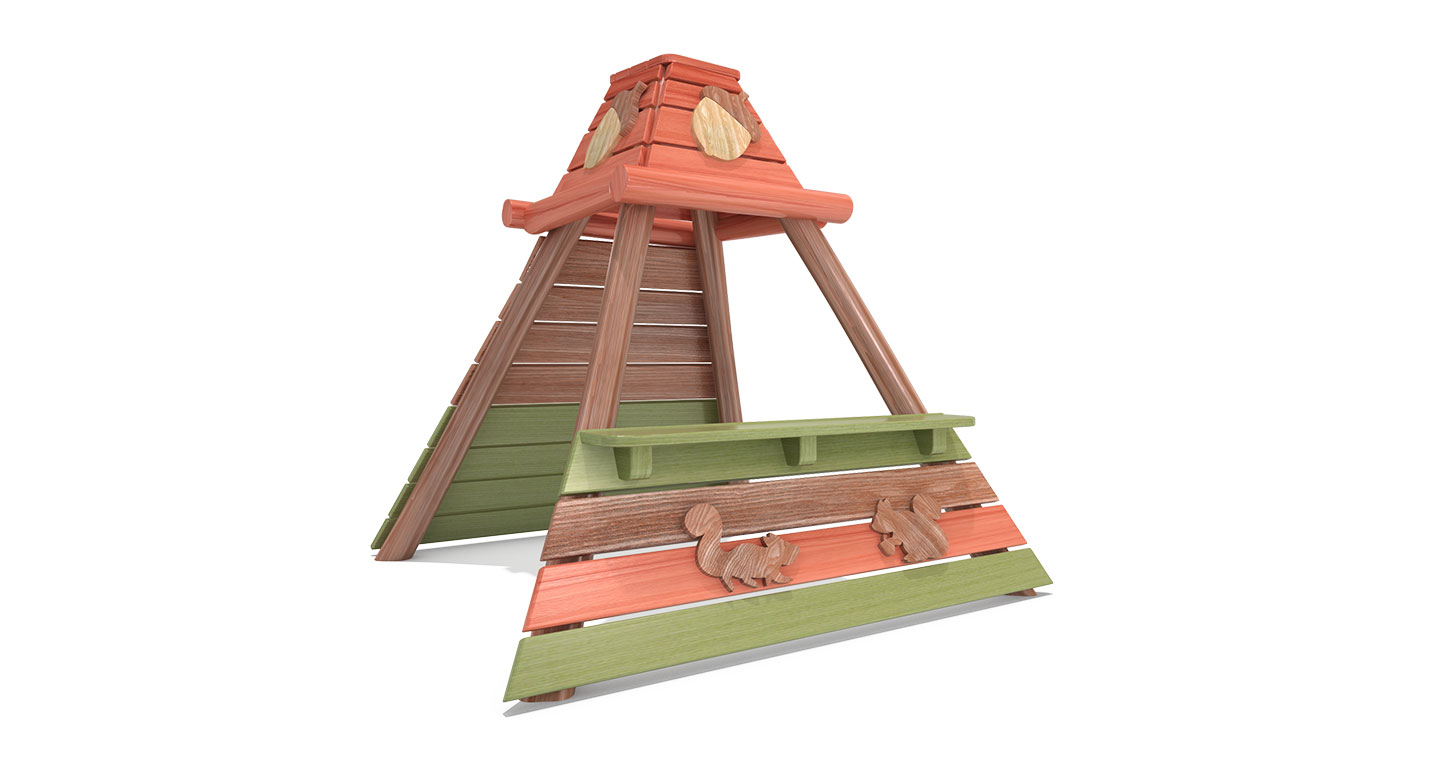 인디언 텐트를 모티브로 만든 자연목 놀이집으로, 아이들이 안으로 들어가 숨거나 모여 이야기하며 상상력을 자유롭게 펼칠 수 있는 테마형 놀이공간입니다. 로비니아 목재의 따뜻한 질감과 전통 패턴 디자인이 조화를 이루어, 정서 안정과 창의 놀이에 적합한 휴식형 놀이시설입니다.